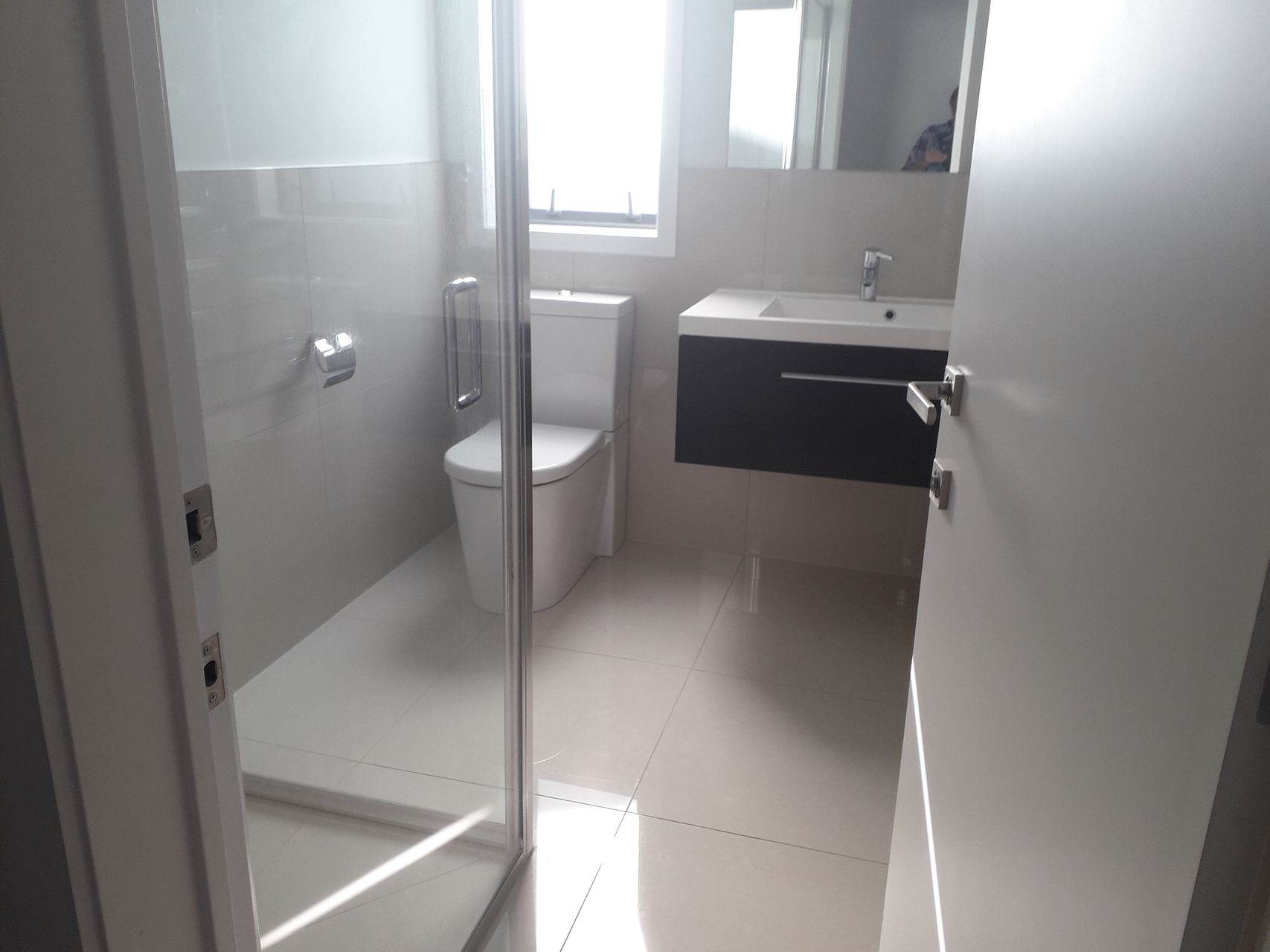 Tiled shower in bathroom with modern vanity and large mirror.