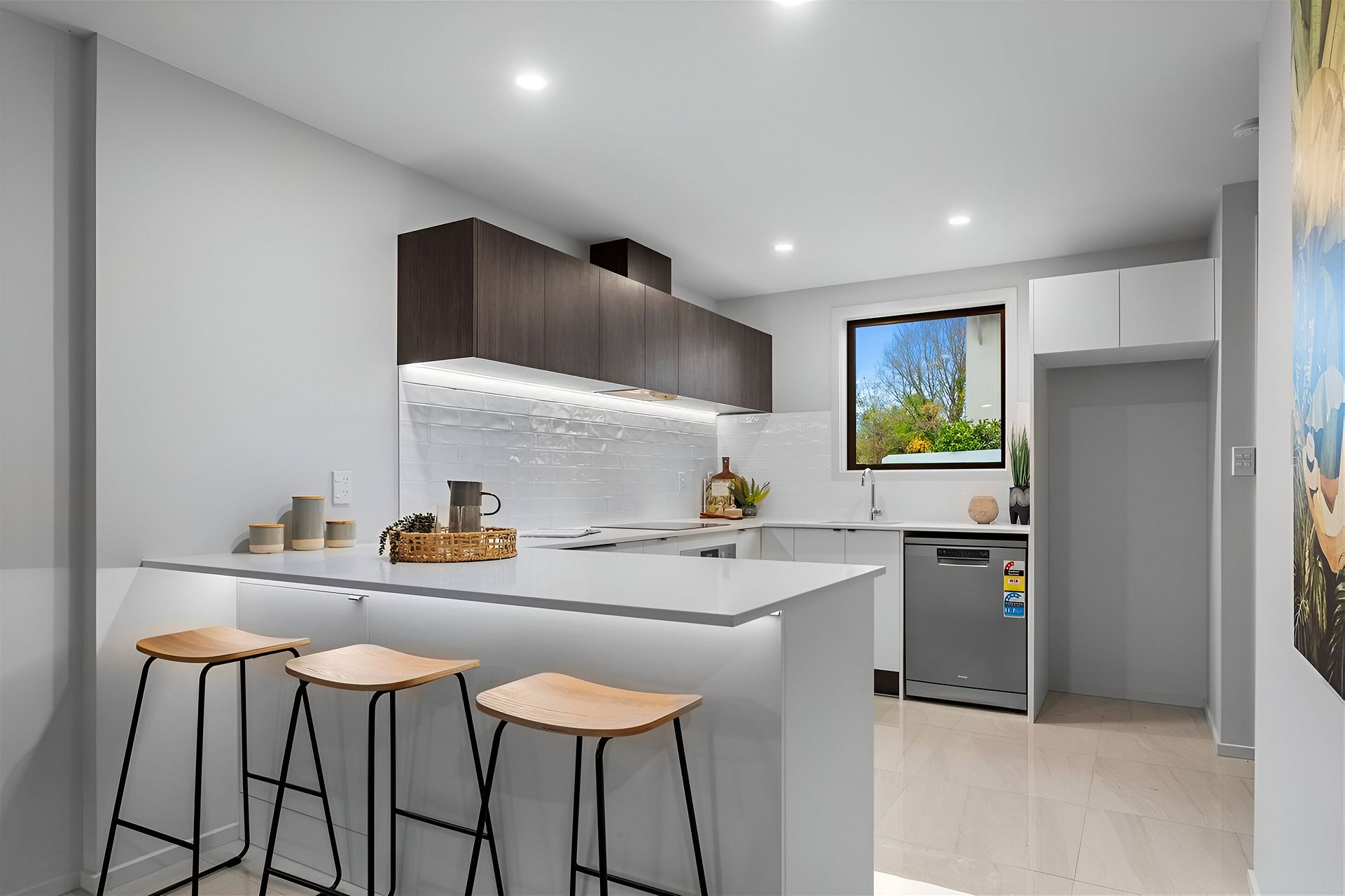 Modern kitchen with stainless steel appliances and dishwasher.