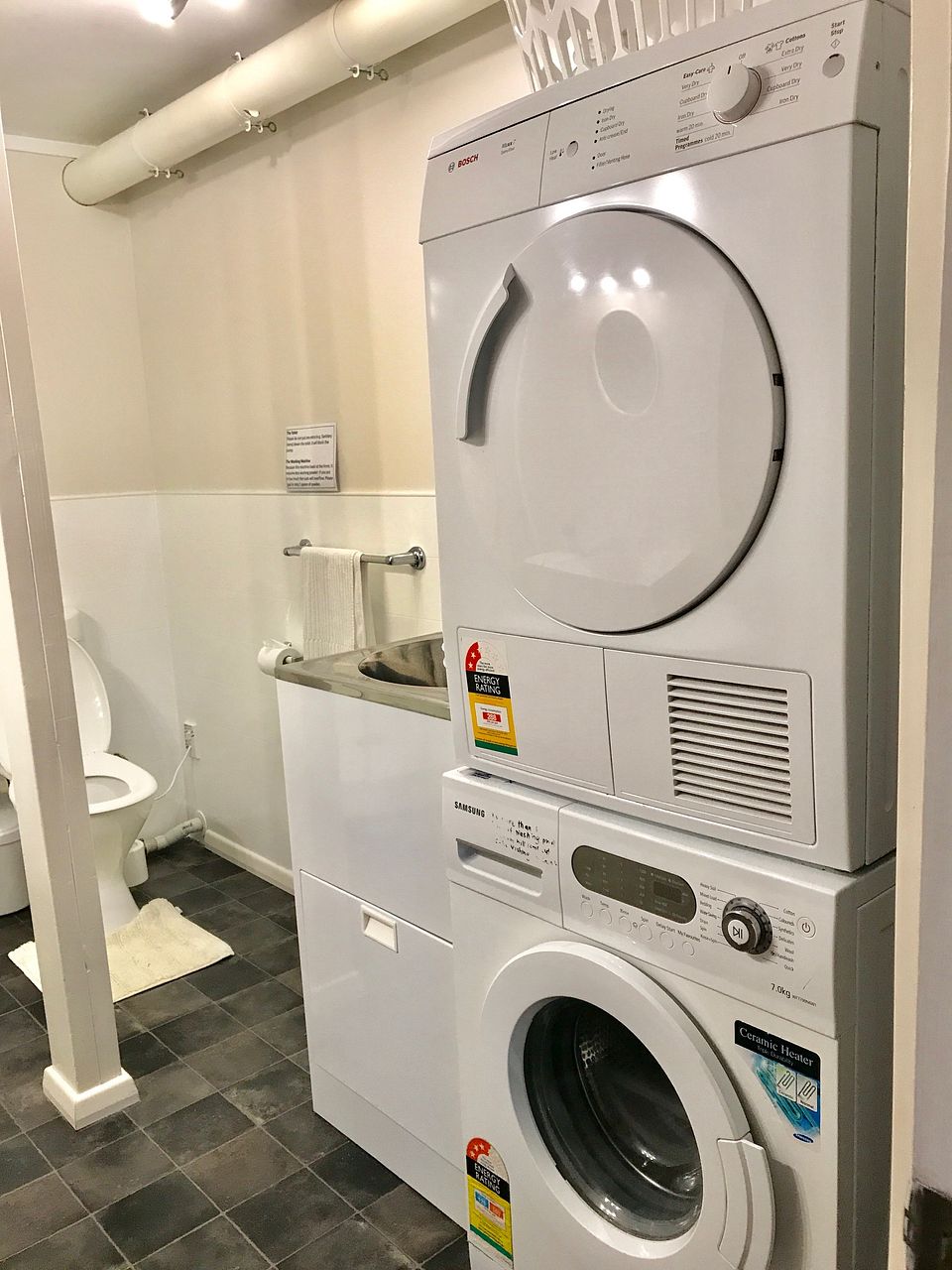 There is a bathroom between the lower bedrooms too . It has a shower cubicle and laundry included with a large washing machine and dryer. It also has a tub.