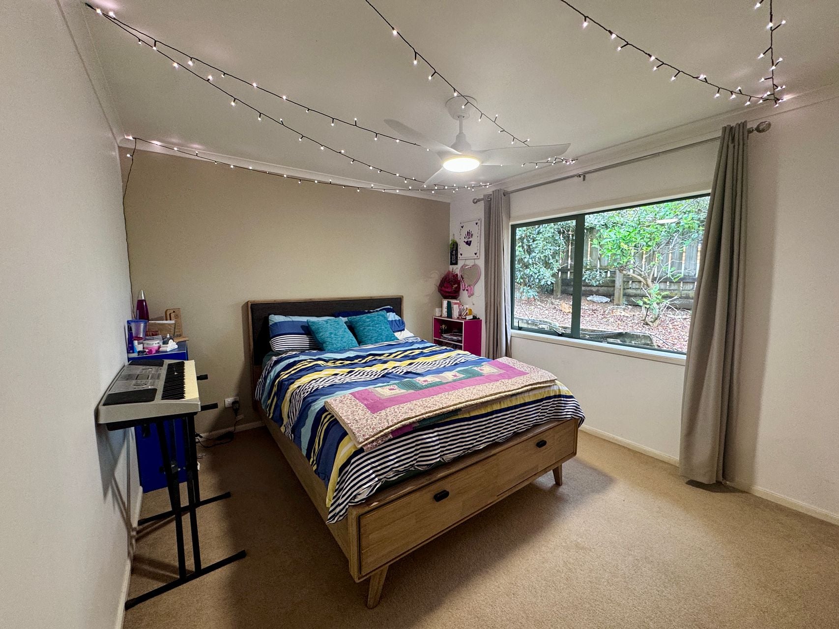 Outside, the attractive grounds are mostly fenced and feature raised vegetable beds and established fruit trees, creating a welcoming and easy-care outdoor space.