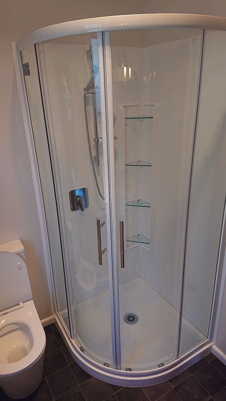 -Recently renovated bathroom with shower, toilet and vanity