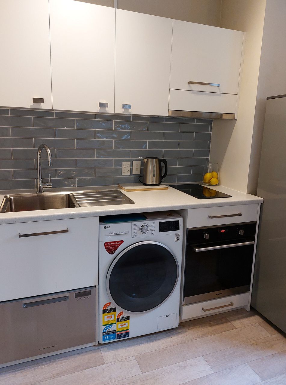 Near new kitchen with induction cooktop, new oven and dishdrawer. Microwave and washing machine/dryer included plus kitchen items are provided.