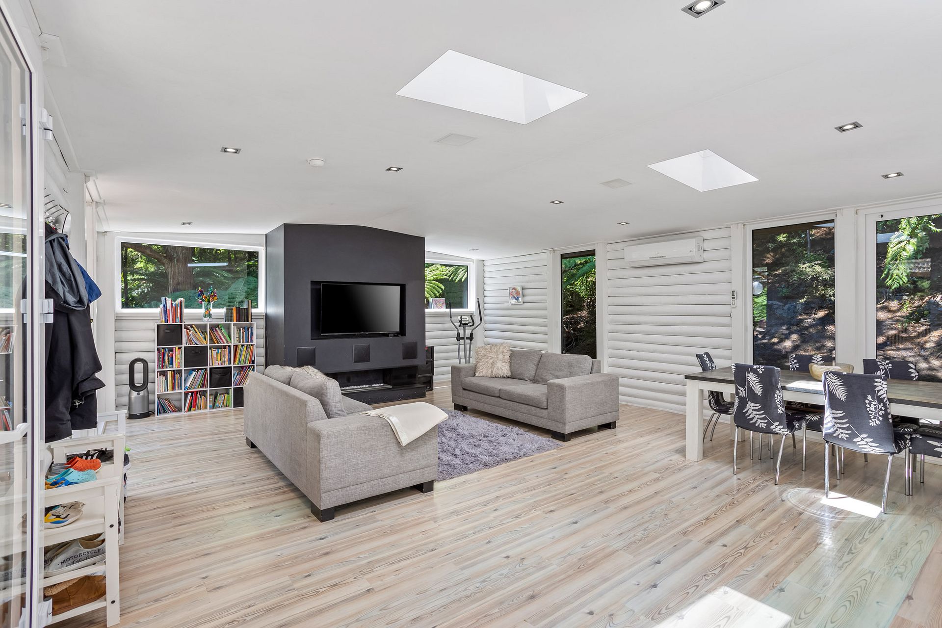 - Open-plan lounge with skylights and a fitness corner equipped with an elliptical trainer.