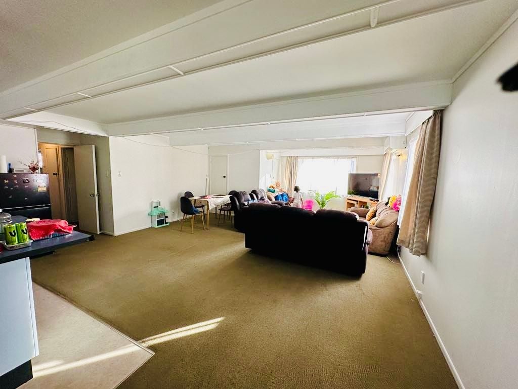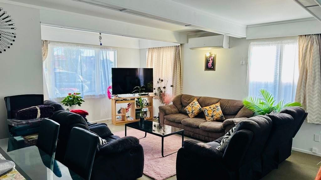 Open plan dining with large living room and a centrally located heat pump.