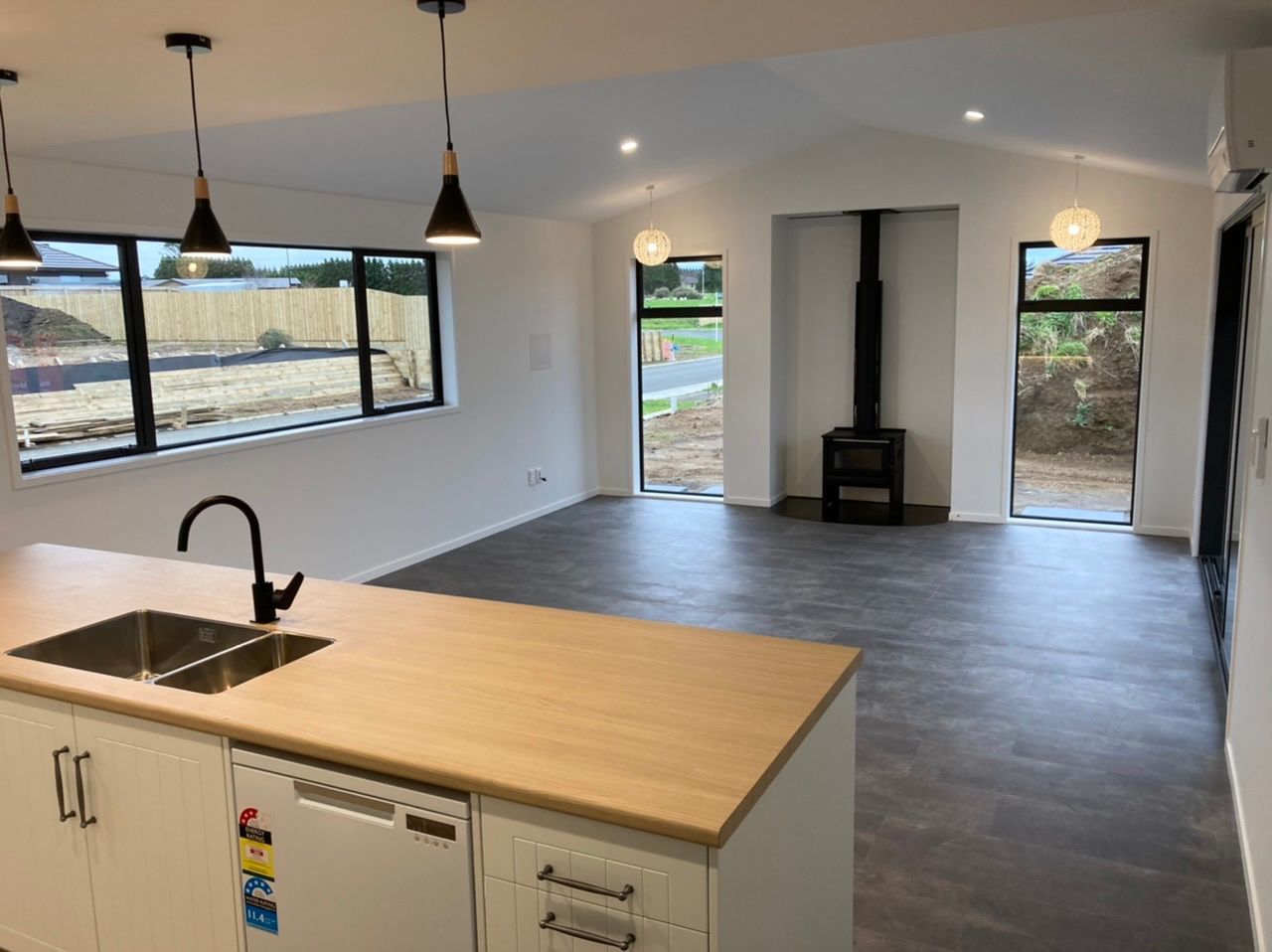 Sunny open plan kitchen, dining and living area with a new heat pump and fire place.