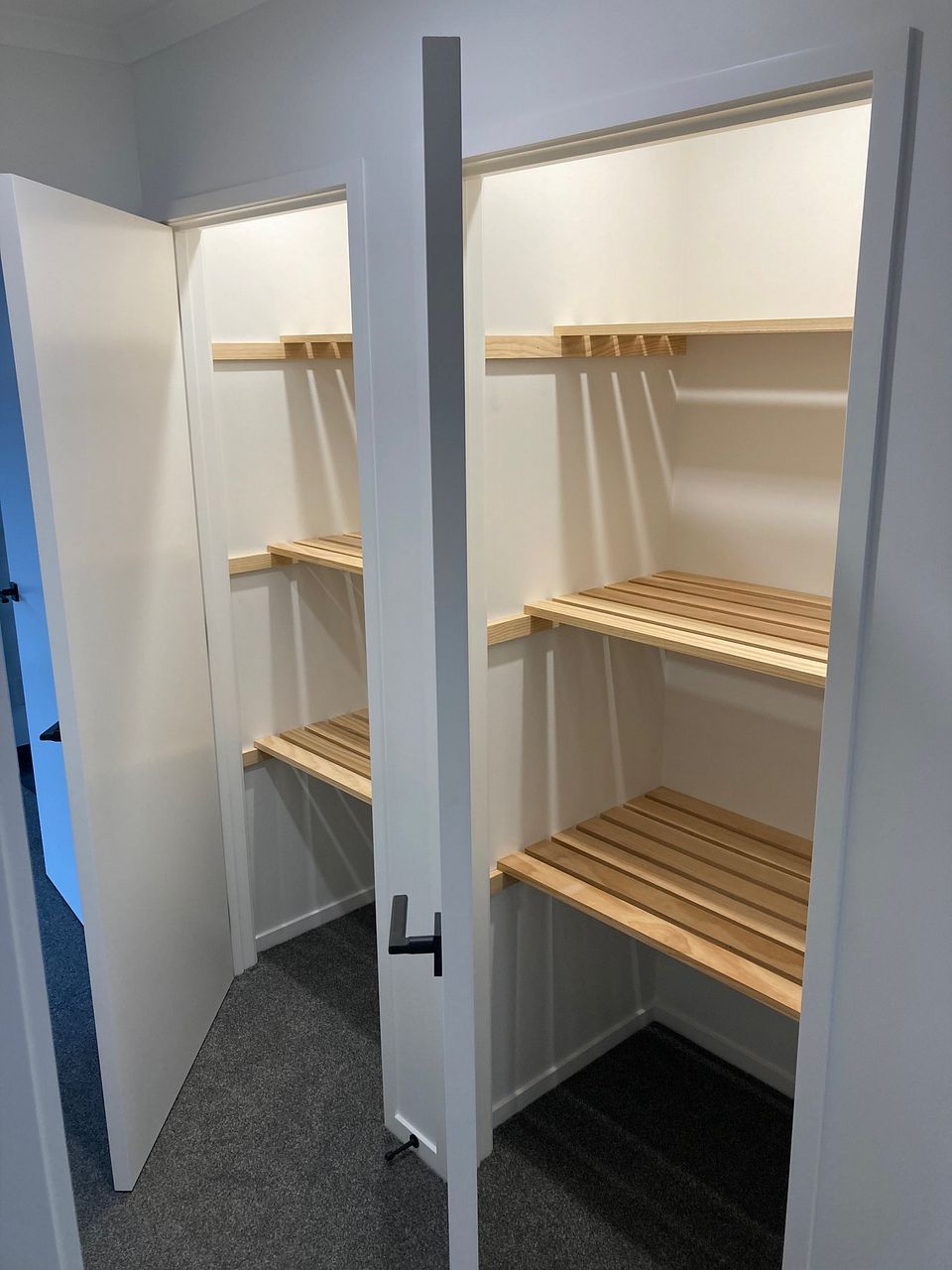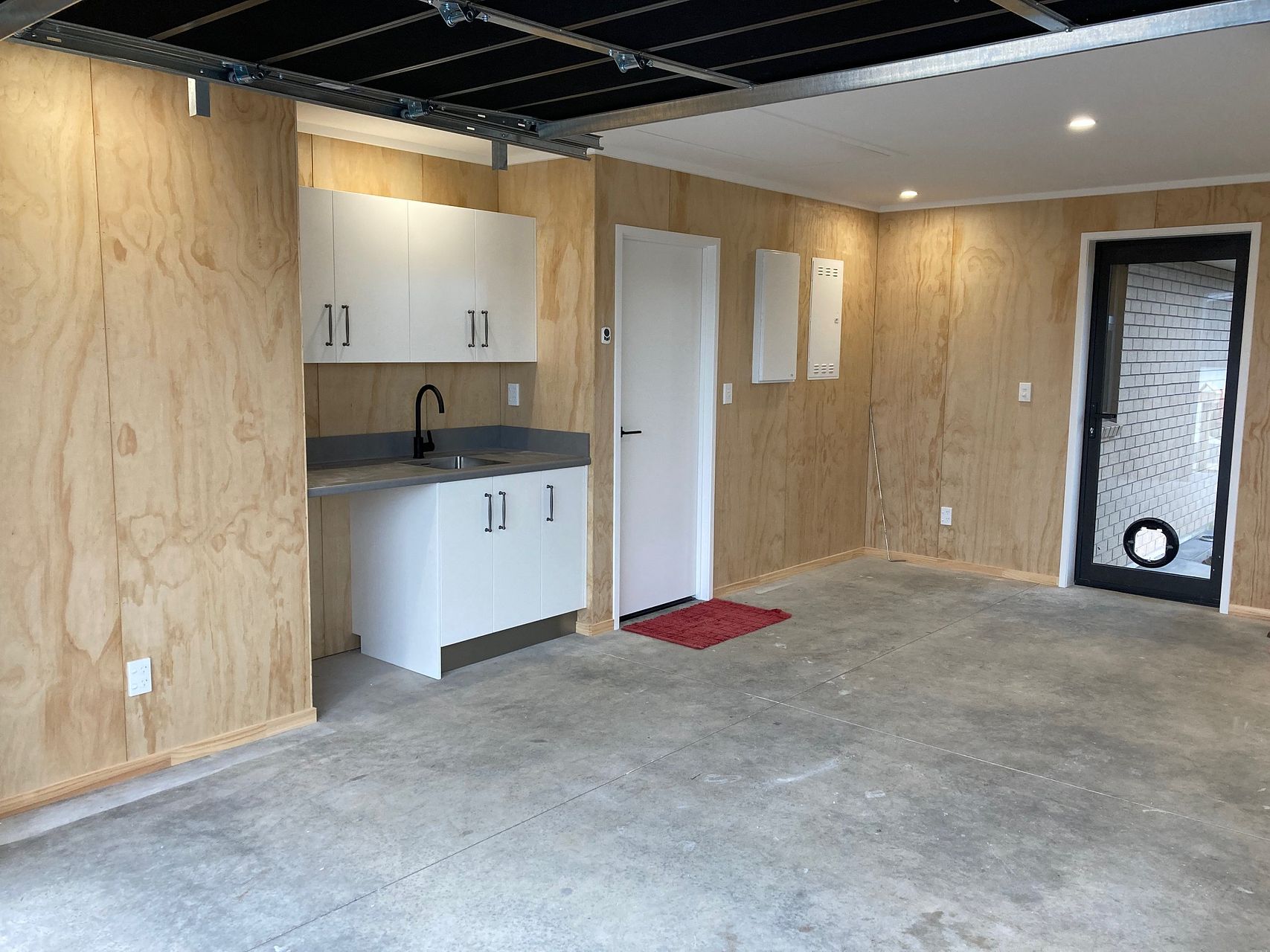 Remote access internal double garage with a dedicated laundry area including extra storage.