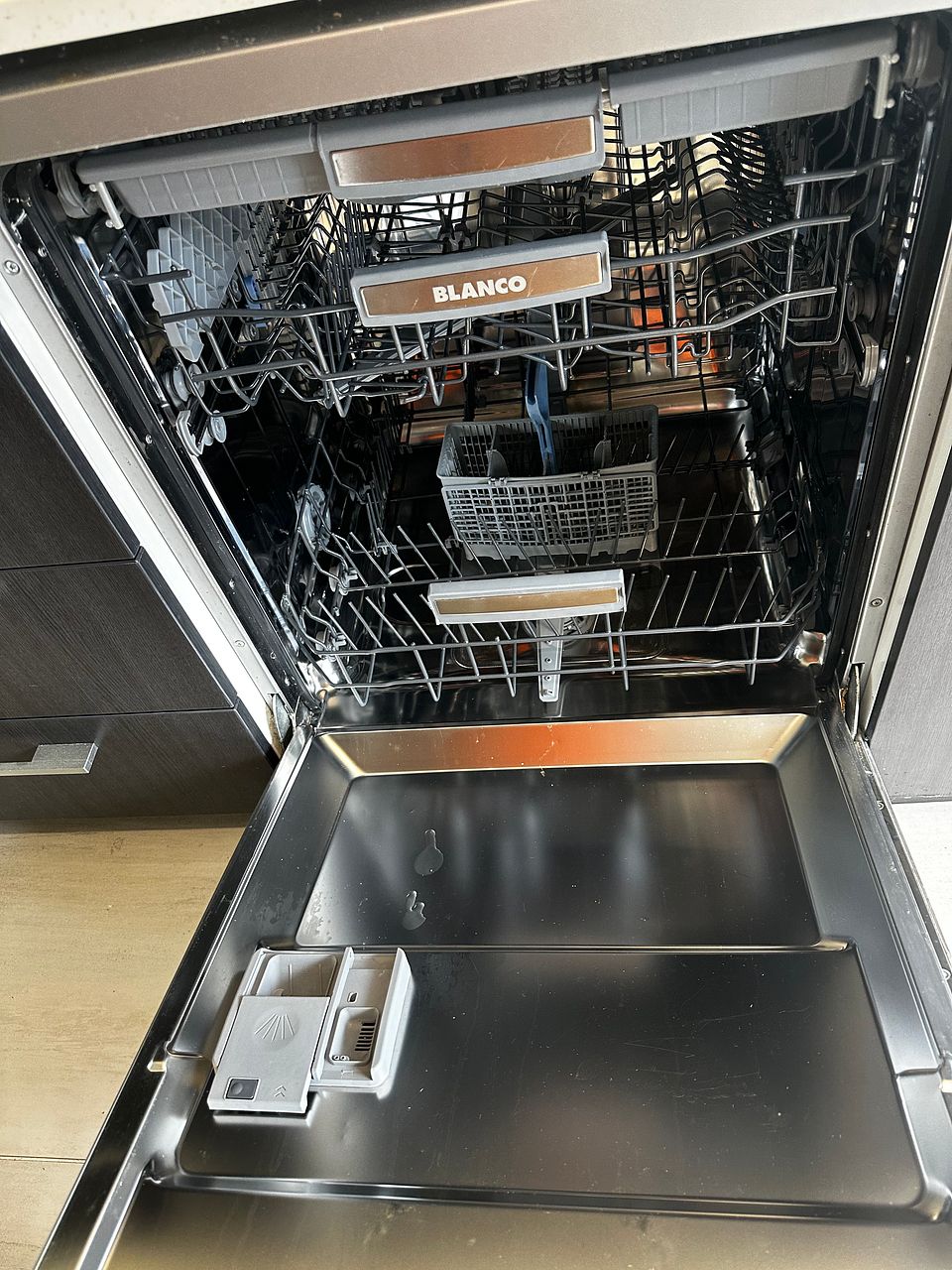 Designer kitchen is open to dining and lounge with quality stone top, Blanco appliances and crafted cabinetry, pull out kitchen bin plus latest Samsung mirror black fridge/freezer.