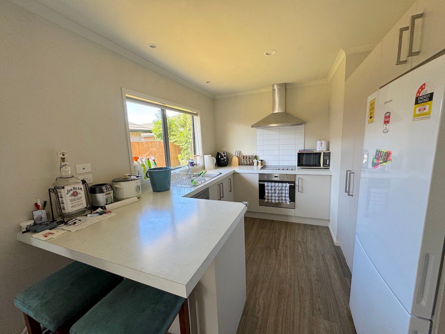 The open plan kitchen, dining and living room have features of dishwasher, double sinks, waste grinder, separate cooktop and oven, breakfast bar, and air conditioner.