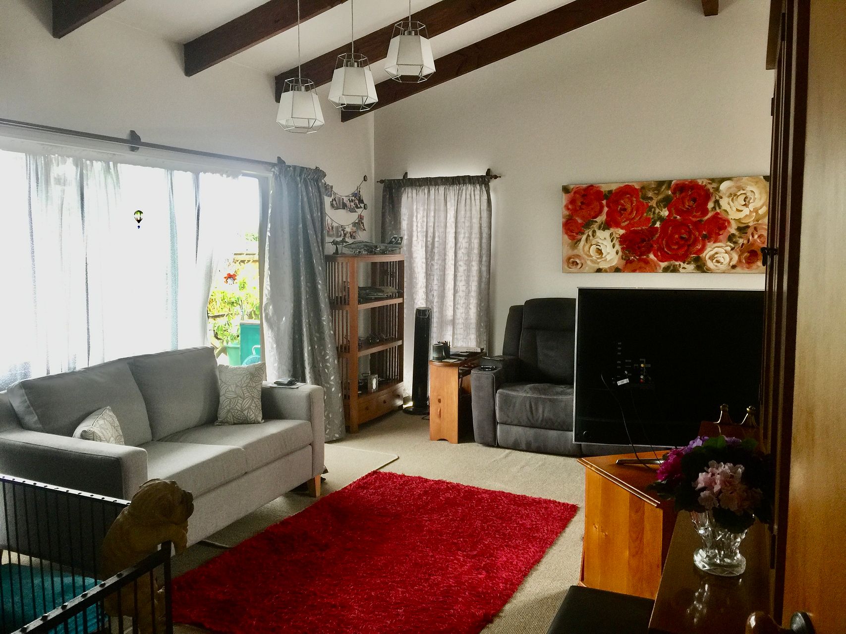 Sliding doors from lounge open to north facing deck and fully fenced lawn and garden area.