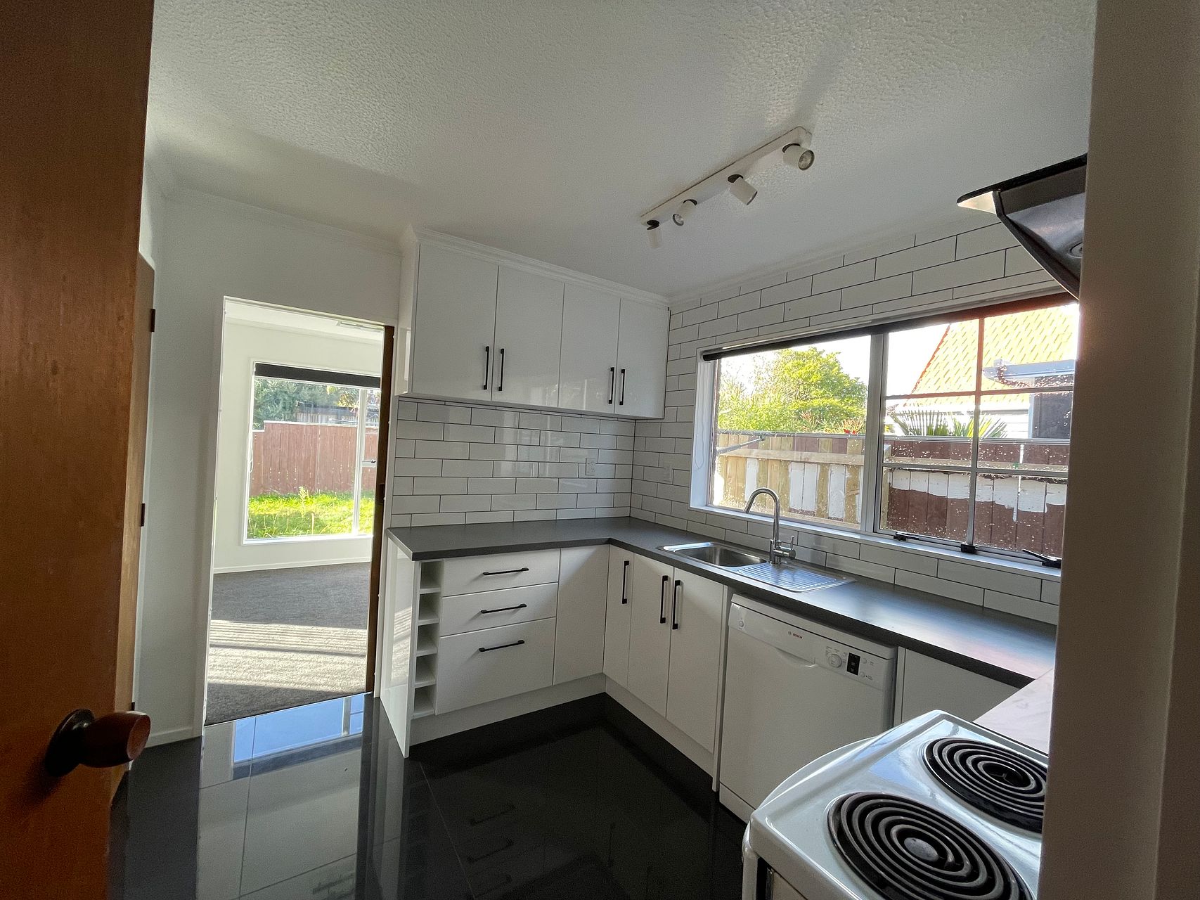 • Semi-open plan lounge, kitchen, and dining area downstairs, leading to a north-facing private backyard through a ranch slider.