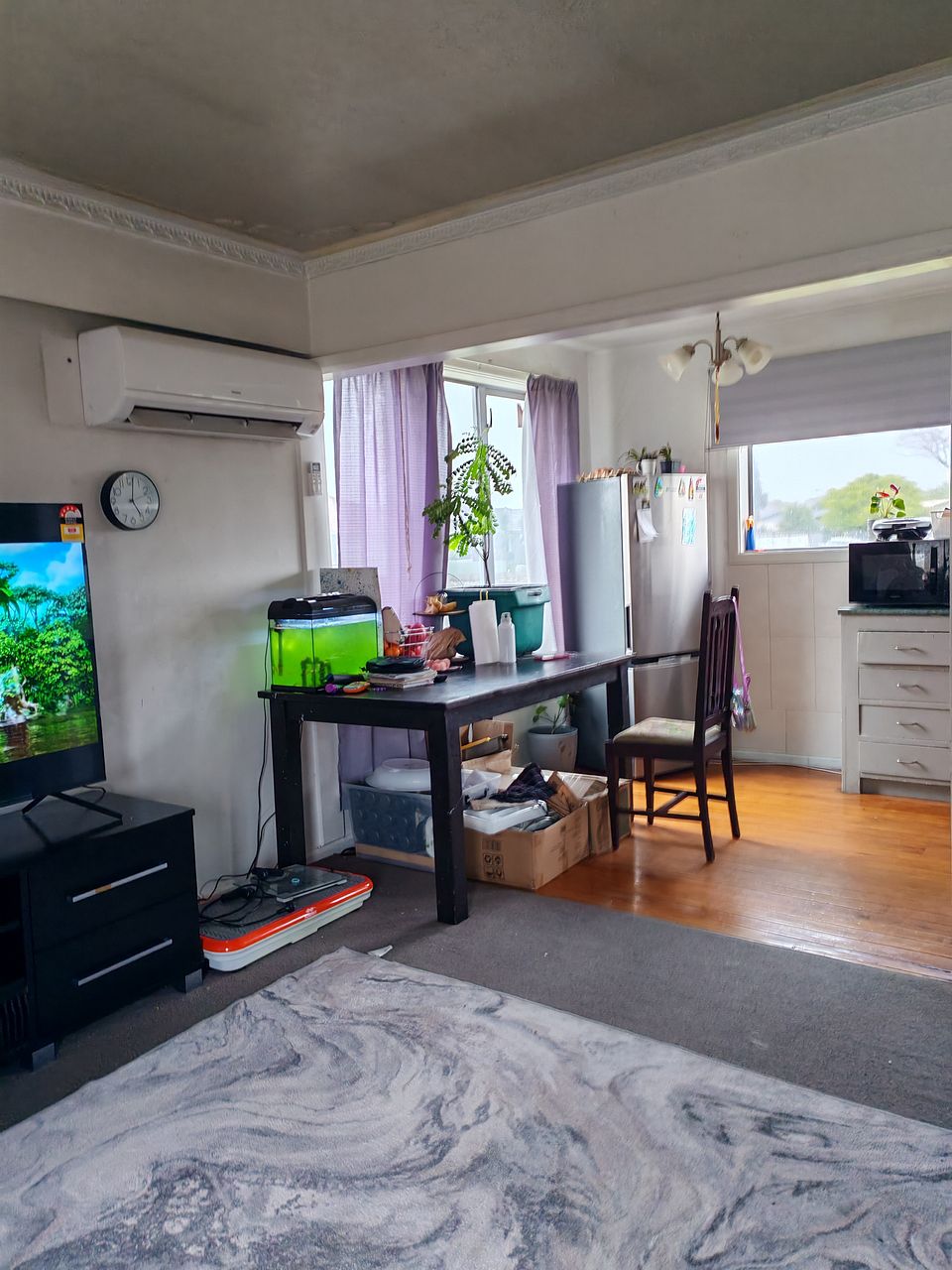 The kitchen, featuring plenty of storage, wooden floors, a dishwasher, and rangehood, flows seamlessly to the dining area and open-plan lounge with heatpump.