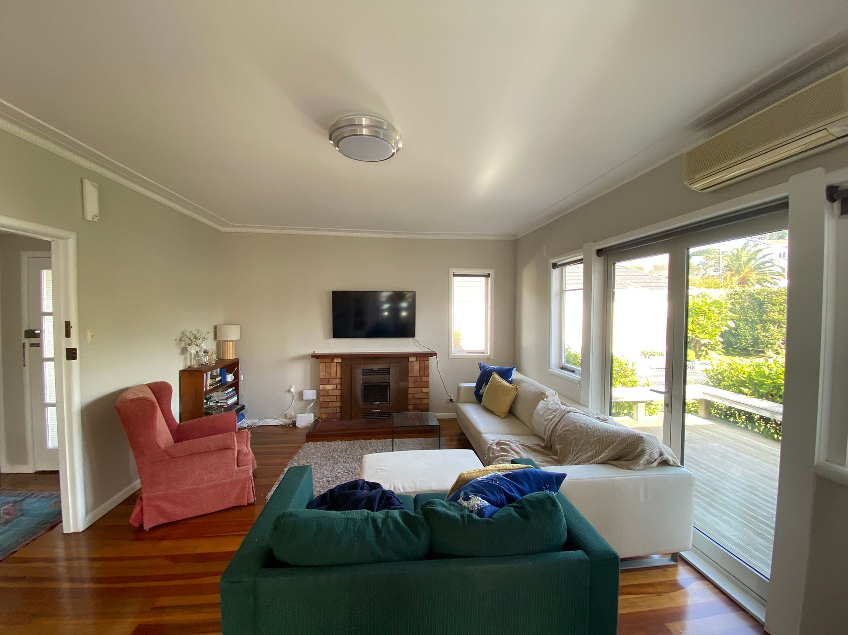-Spacious lounge with heat pumps and a fire place.