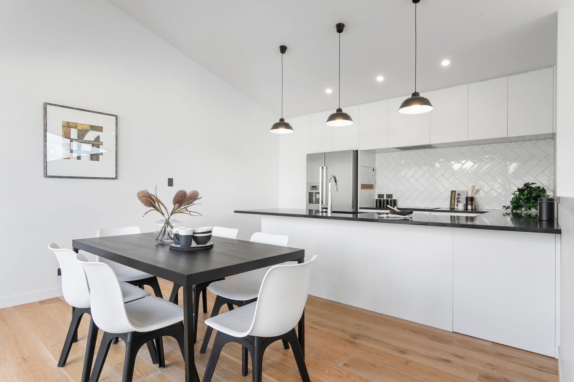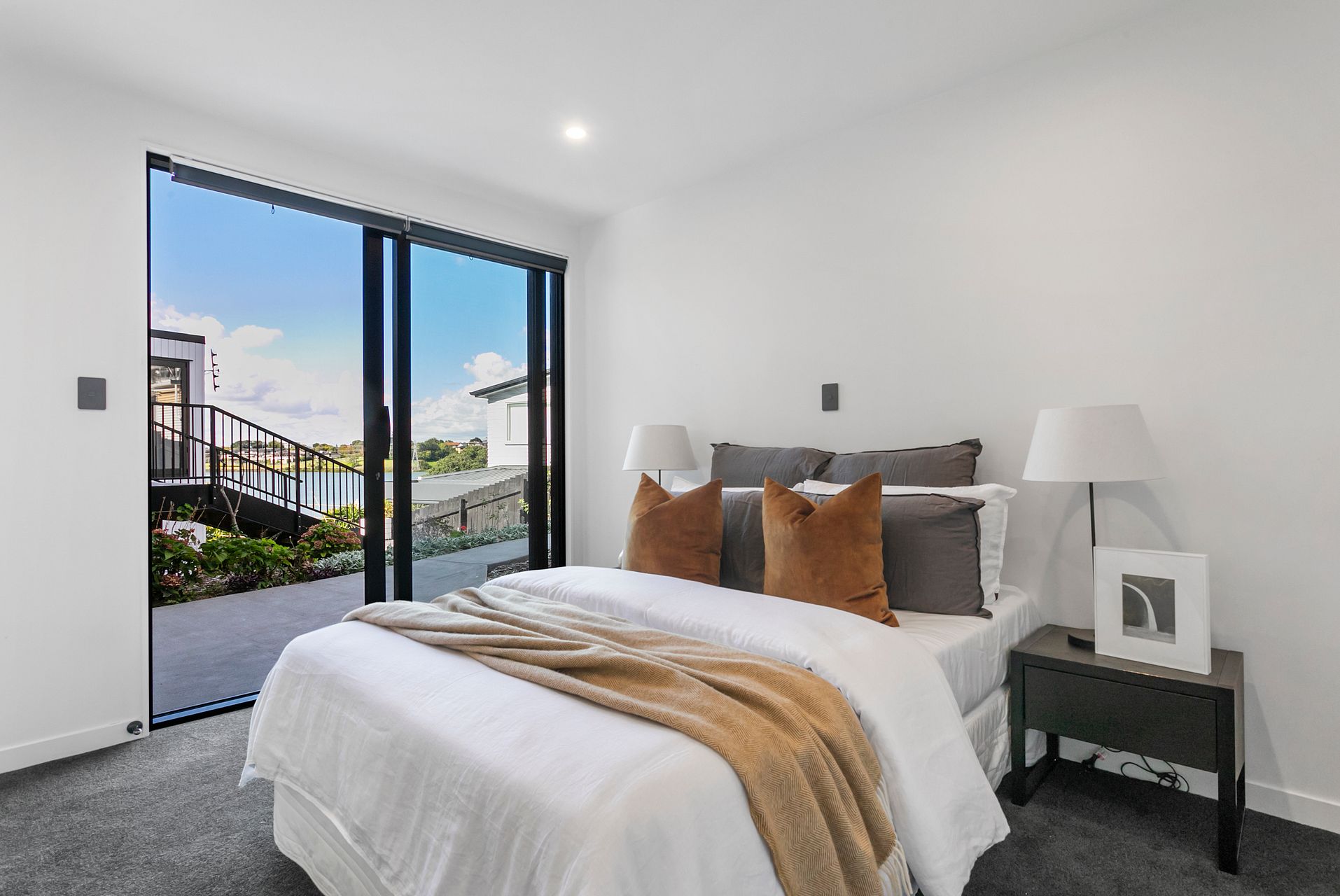 Sculpted into the site, the building ranges across two luxurious floors embracing a covered central courtyard for all-season socializing. Anchored by solid oak flooring the interior displays an on-trend décor with lucent Shoji screens, monochromatic tones, matt black door hardware and imported European light fittings. Easy flow leads to generous Vitex hardwood decking for the summer barbecues and sunny sprawls. Alongside this a sensational kitchen with white herringbone splash back blends with quality Fish and Paykel appliances. Three bedrooms all have water or garden views with two comprising exterior access. Japanese inspired family bathroom and ensuite to master. Powder room upstairs.