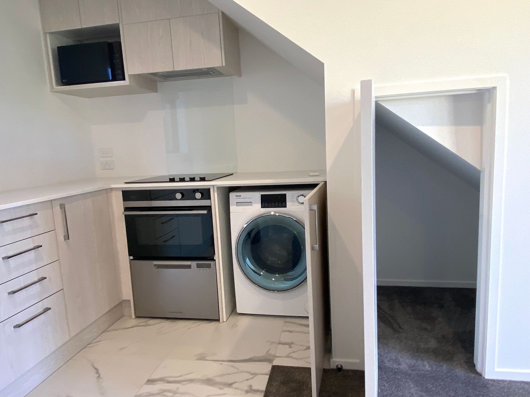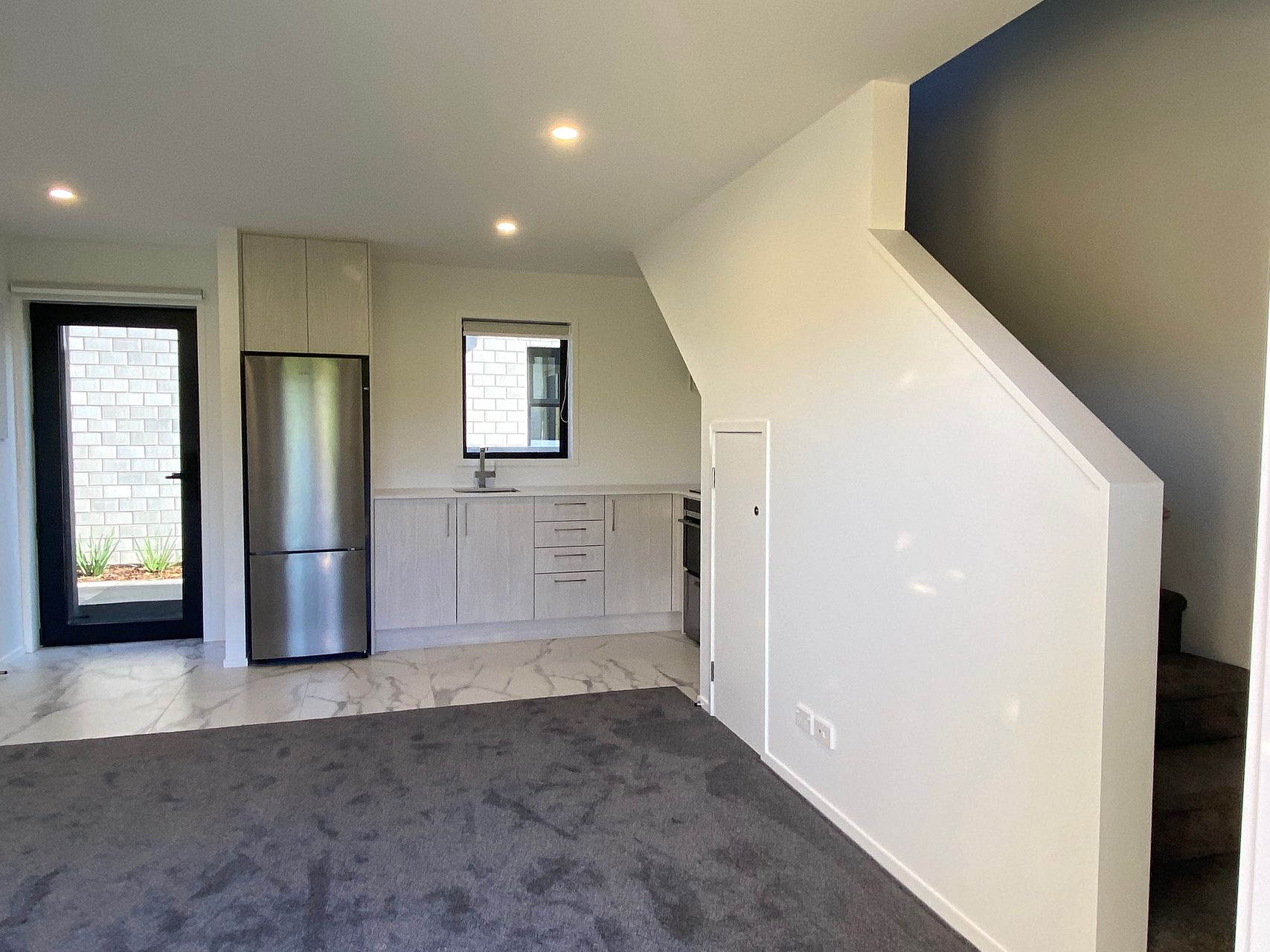 Downstairs: Open plan kitchen/dining and living area. Storage under stairs.