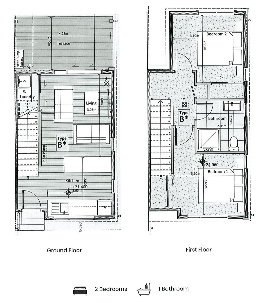 - 2 bedrooms, 1 bathroom