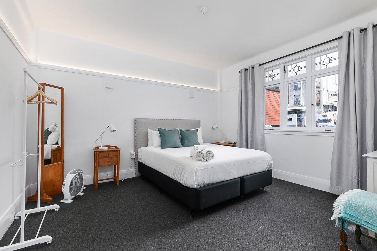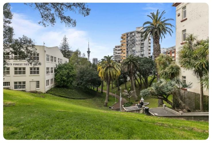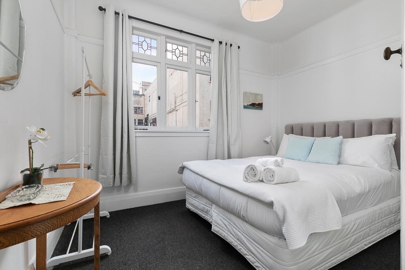 On Myers Park - Espano is a 1920s building with only 12 apartments. This Character apartment is on the 2nd floor from the top with beautiful views over the park to the sky tower. The living room is sunny north facing. There is a separate kitchen and spacious master bedroom. The second bedroom is also a Queen size. There is a communal roof terrace with great views of the park and city.