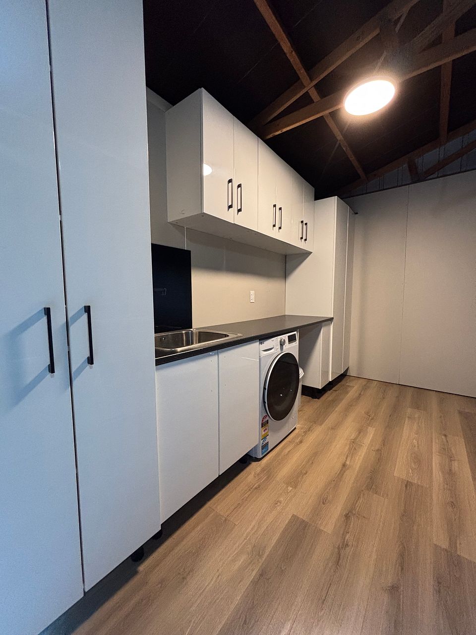 - Separate laundry and storage area. Washing machine and dryer area.