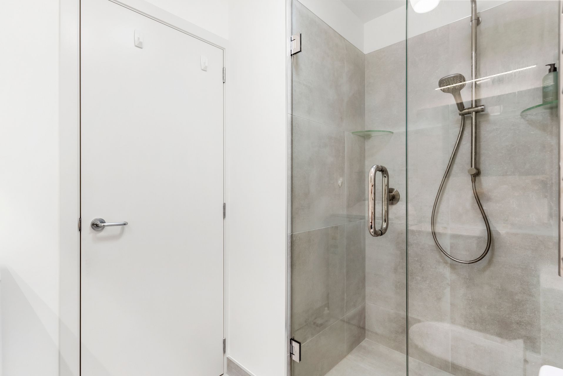 The bathroom has a tiled walk in shower.