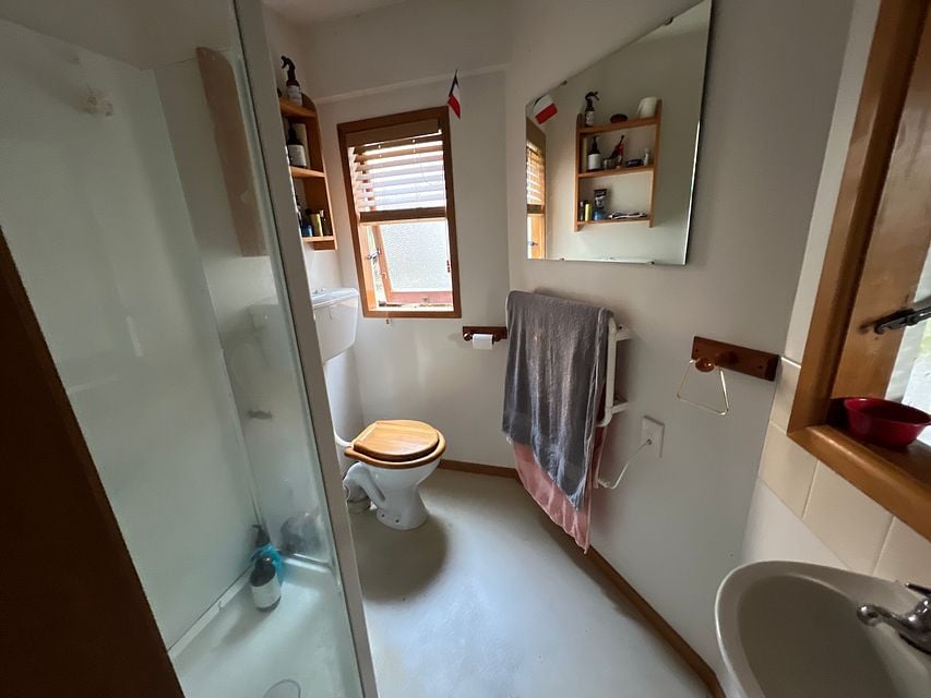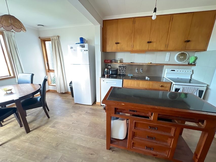 The good sized lounge is downstairs with plenty of natural light, it opens to a paved patio. Next to the lounge the slightly elevated kitchen and dining is open to a deck.