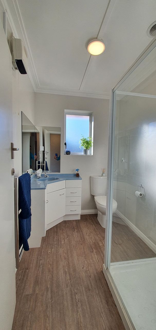 The bathroom has glass box shower with new shower mixer set, wall mounted heater & new heated towel rail.