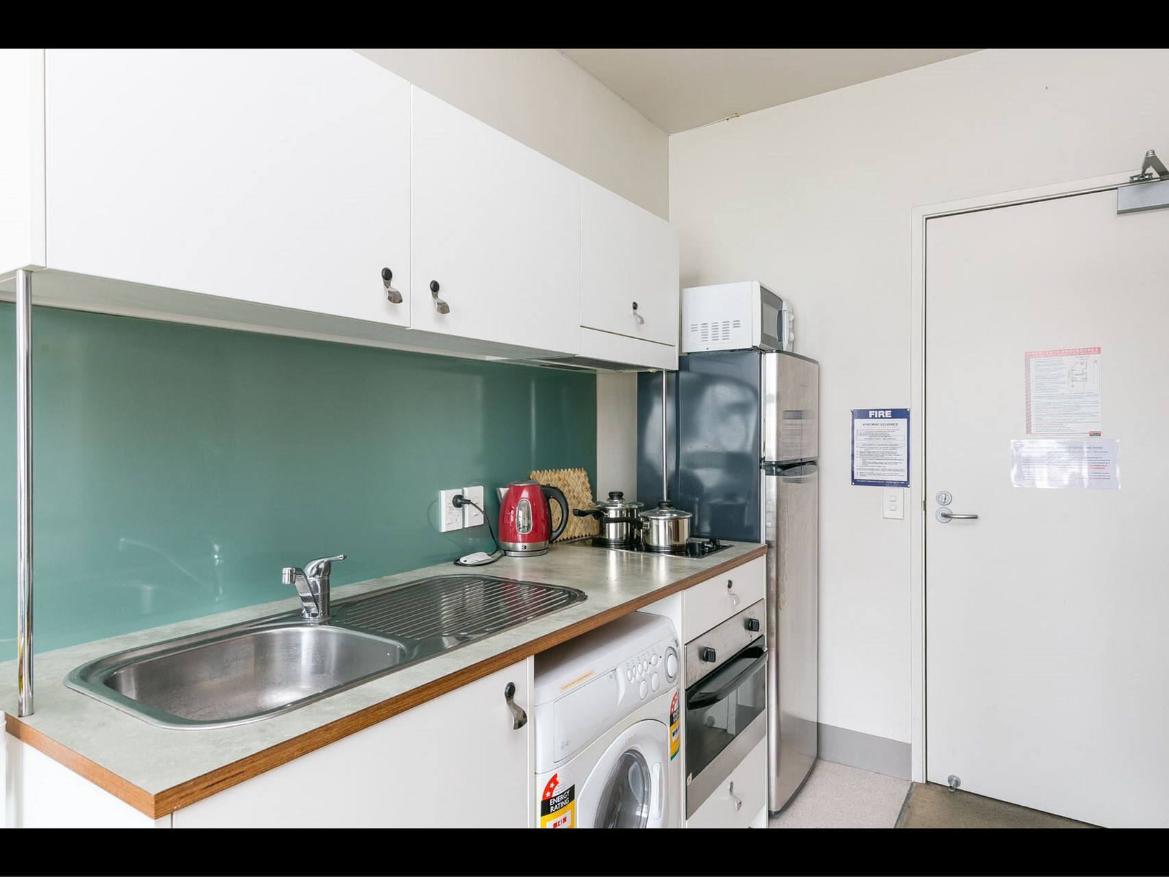 Whiteware is provided, (decent sized fridge/freezer, dishwasher, washer/dryer combo). The kitchen and laundry facilities and bathroom are located in the apartment itself (no need to share with anyone else!). Hot water is also included, so no need for hot water charges in your electricity bill.