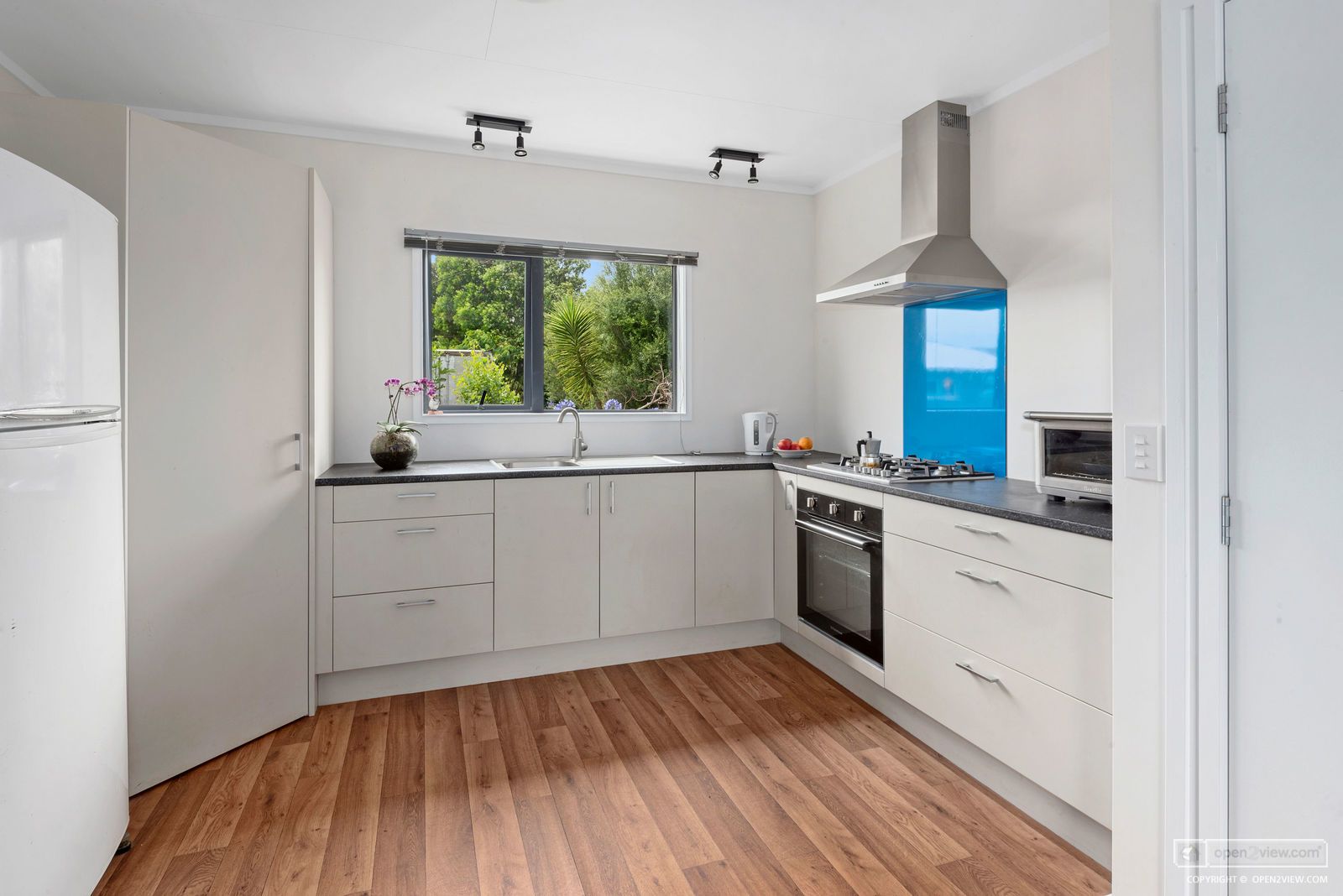 Modern kitchen equipped with oven, rangehood