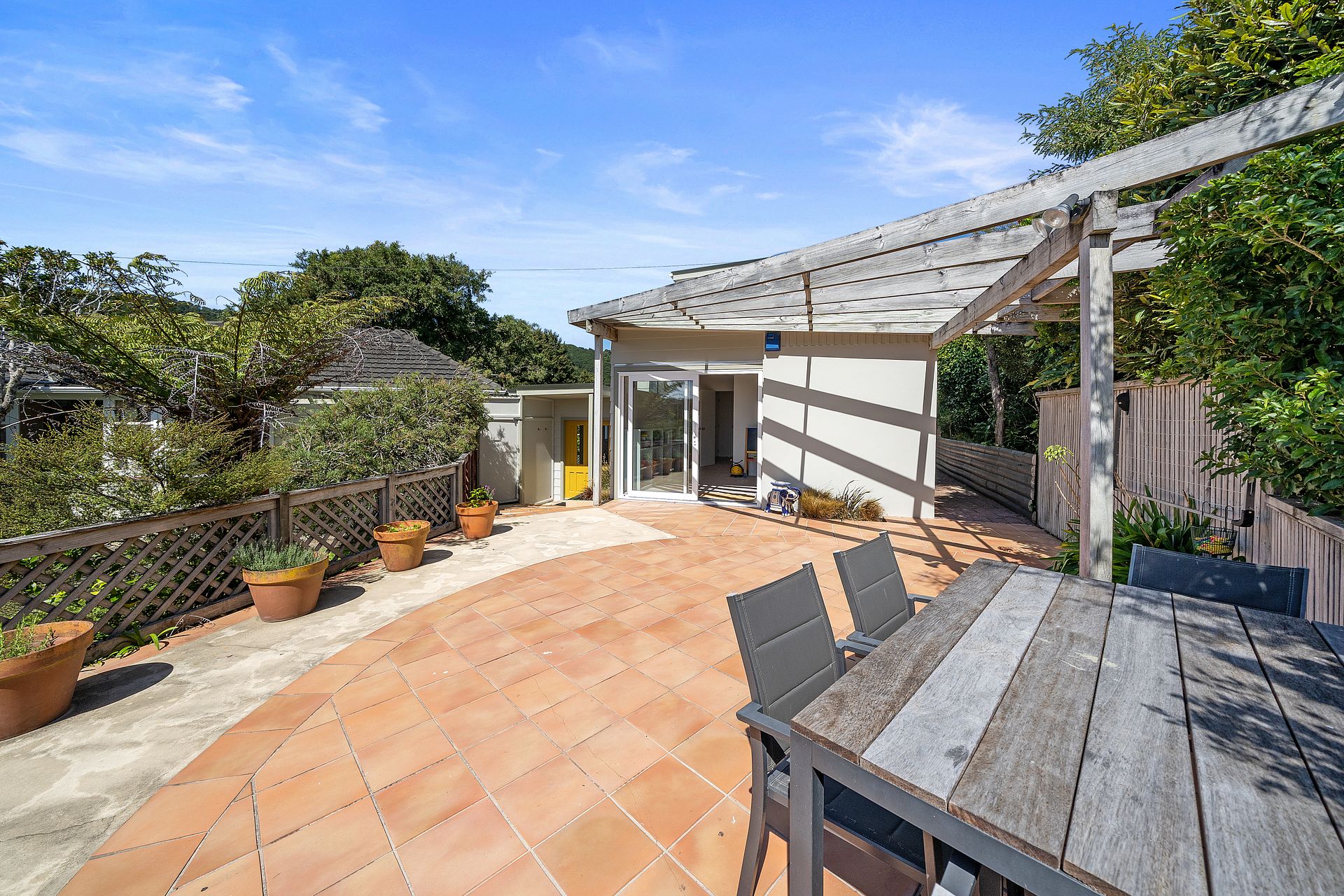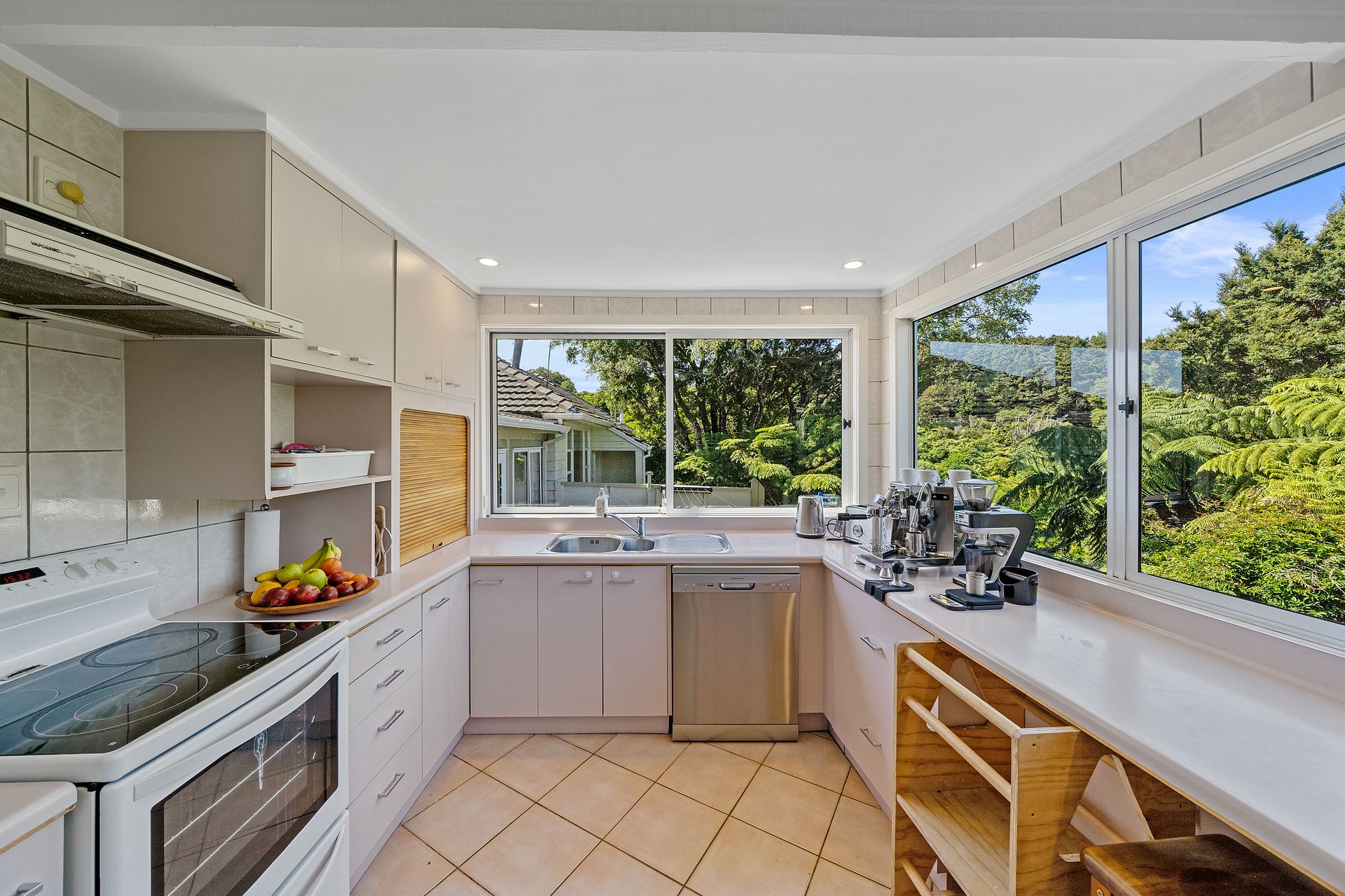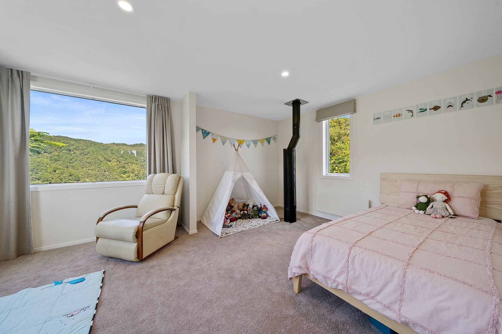A large, 3/4 bedroom, sunny, private family home with bush and sea views. Recently renovated, fully insulated and double glazed.