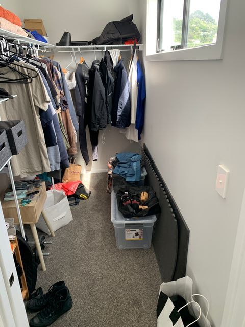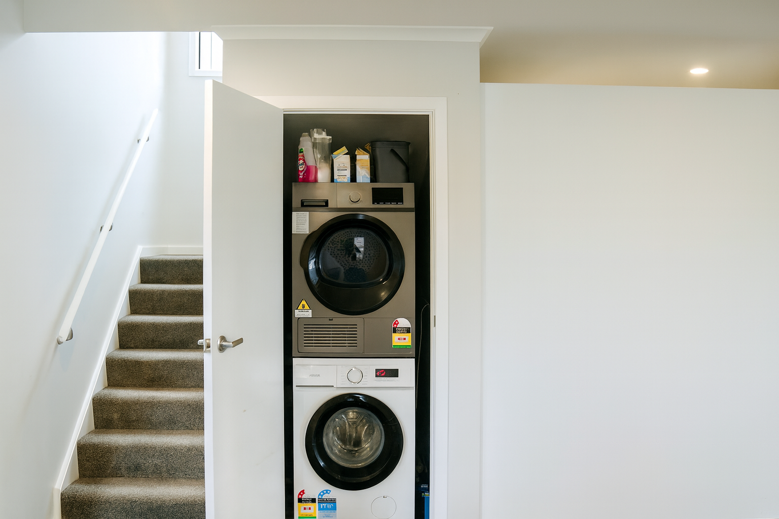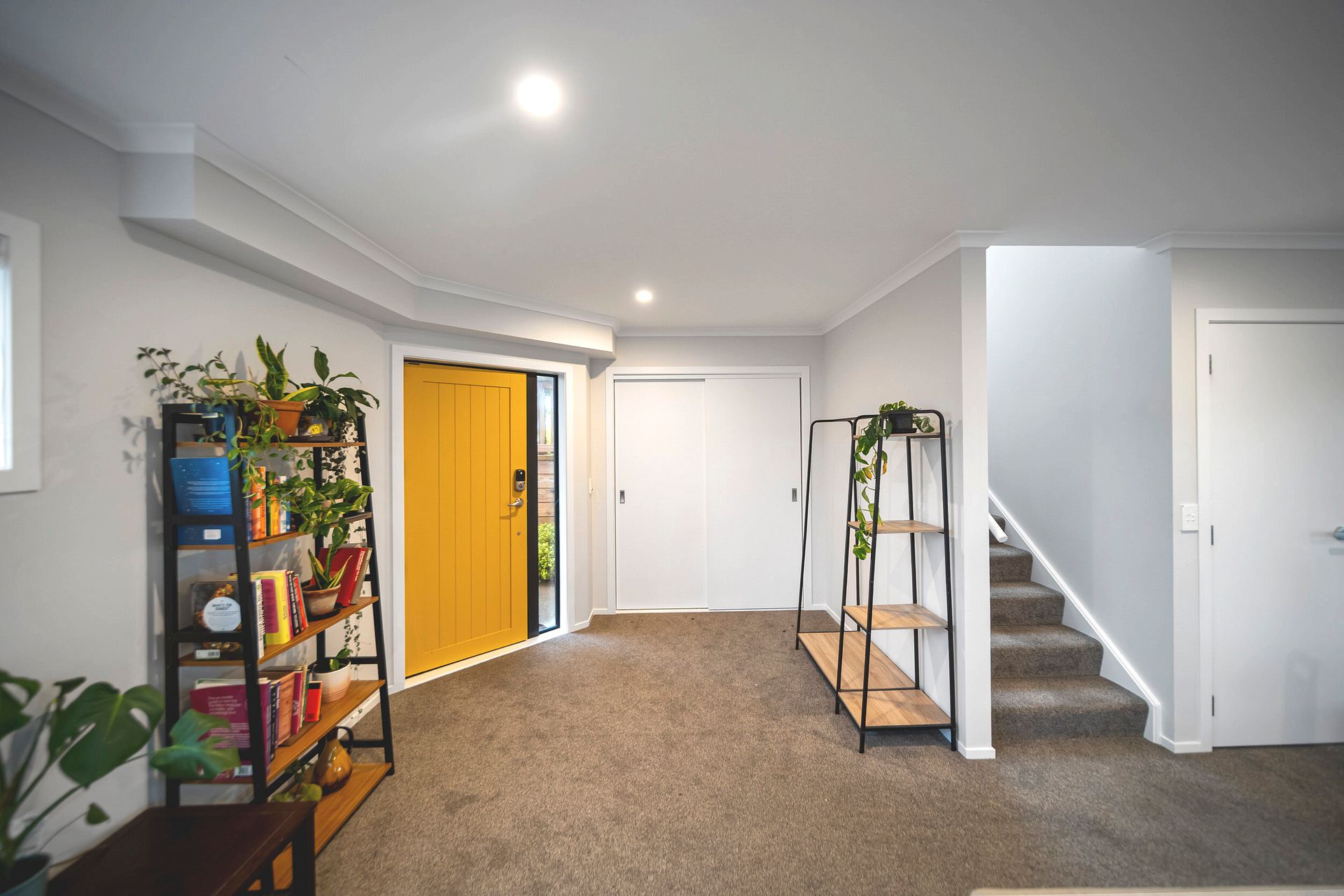 It has open plan living in the lower living area with deck and car parking. Bedrooms in the upperfloor with queen beds and wardrobe shelving included