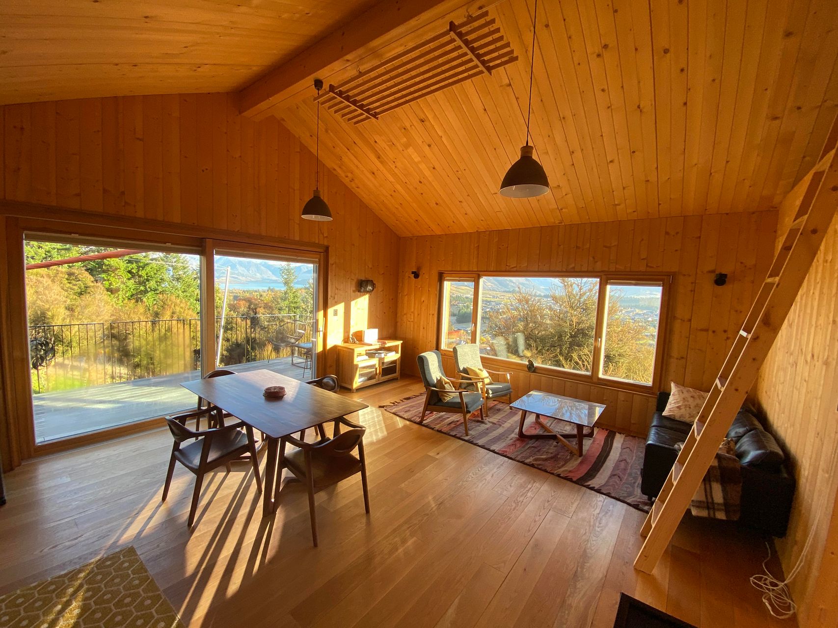 The wooden deck has amazing views to lake Wanaka and the surrounding mountains.