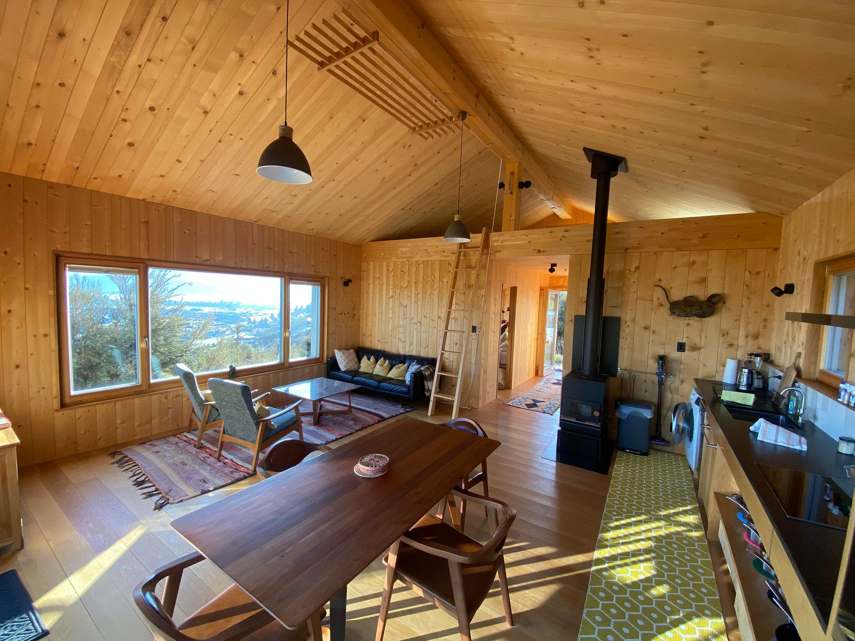 The Chalet has a 60m2 floor area plus a 15m2 sunny wooden deck. It has a seperate bedroom with amazing views of the mountains from the luxurious king size bed. The bathroom is opposite across the hallway. The open main space is comprised of a fully equipped open plan kitchen, dining and living area. A steep ladder leads up to a low mezzanine with a queen bed. Please note that the use of the mezzanine is at your own risk. If there is more then 2 people then the rent goes up to $1500/week.