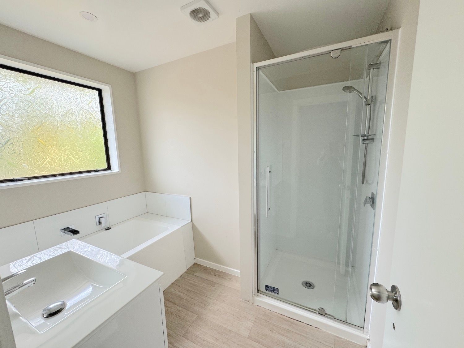 The bathroom has a separate bath and shower. The toilet is separate.