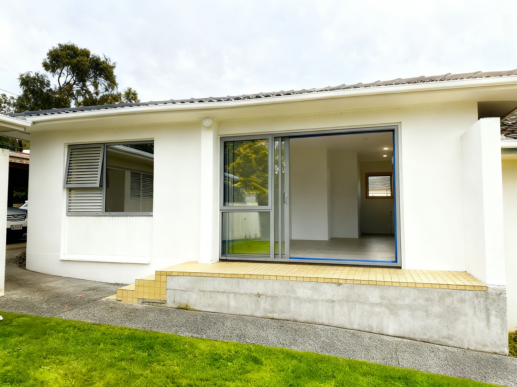 -Spacious Living: Large living area with brand new tiles and double sliding doors leading to outdoor space.