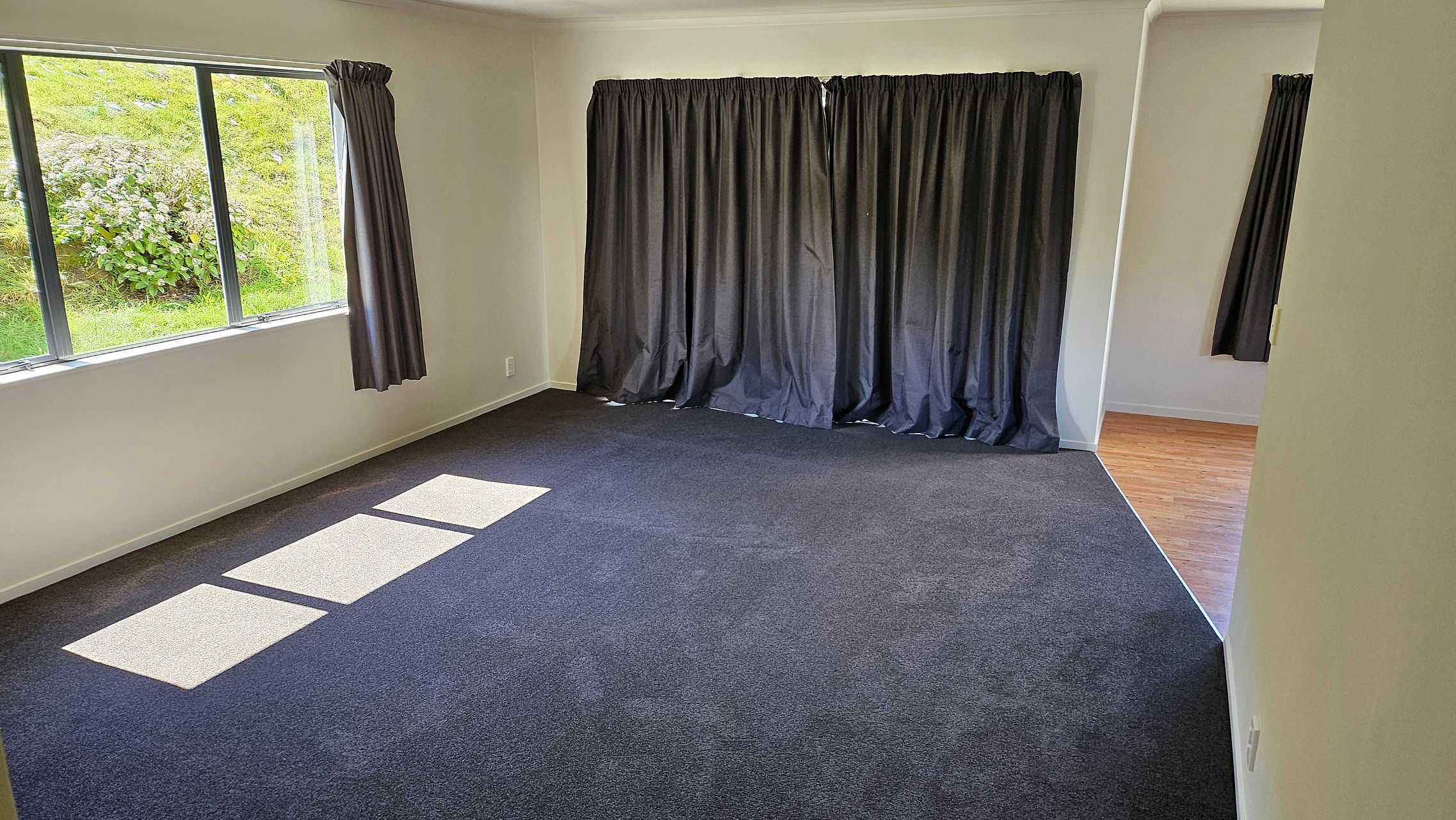 Open plan lounge and dining with kwila decking leading out to a private partially fenced lawn.