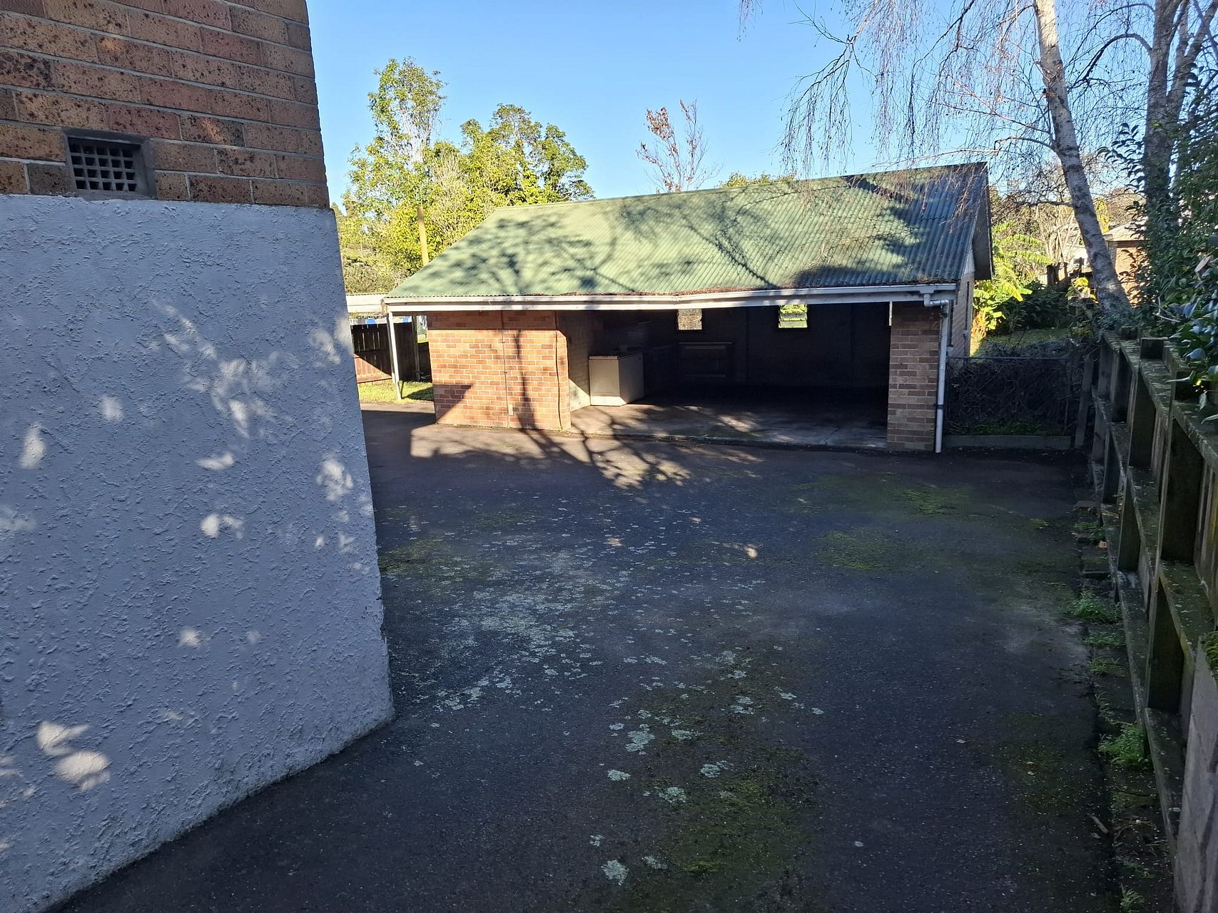 The house is at street level with a sloping driveway going down the side to the back where there is an open fronted garage and a large garden, mostly fenced, with grass and trees.