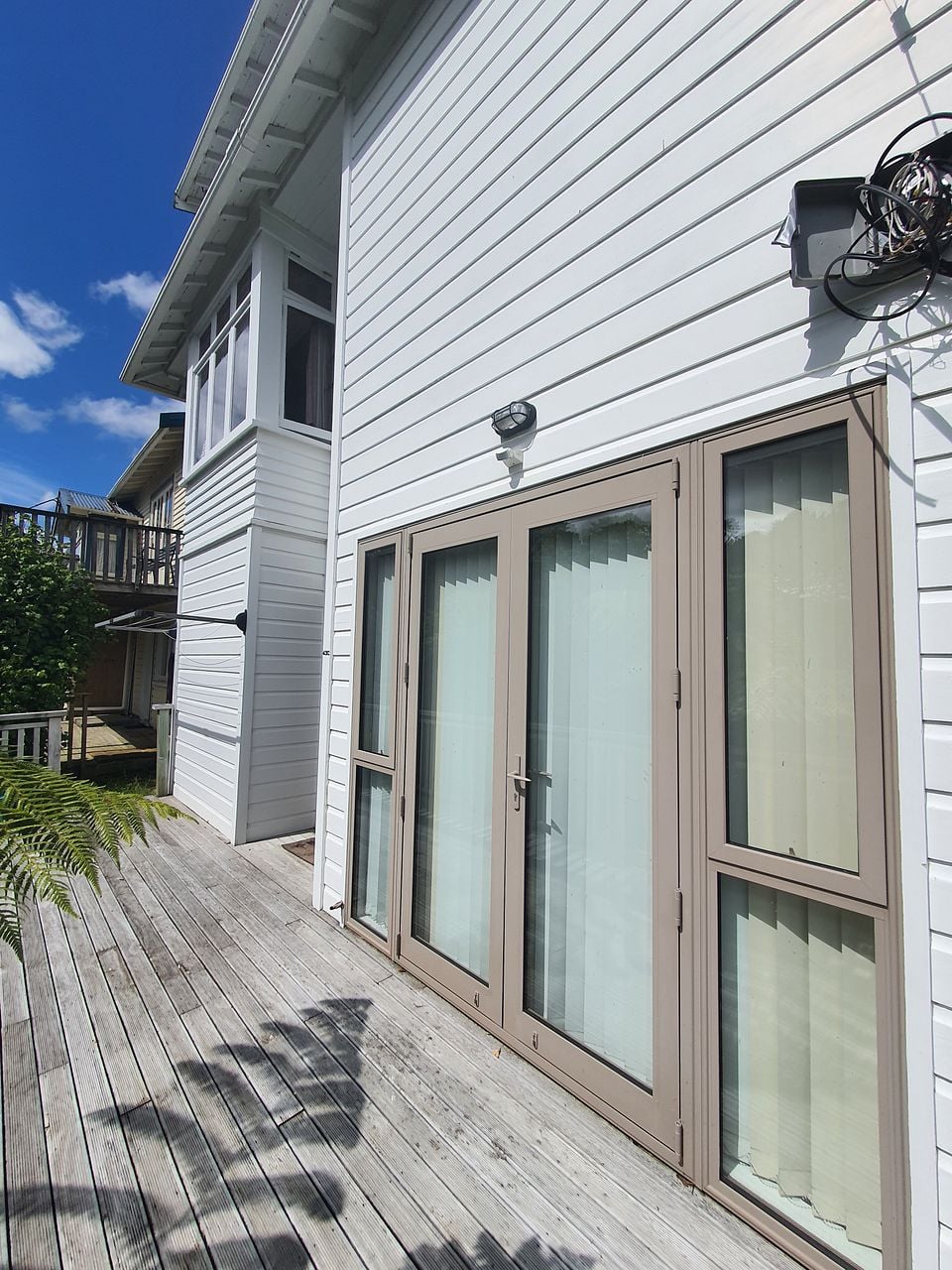 Heatpump, two built in wardrobes/cupboards, separate bedroom, tidy bathroom with shower and kitchen/living area. French doors open onto private deck with washing line.