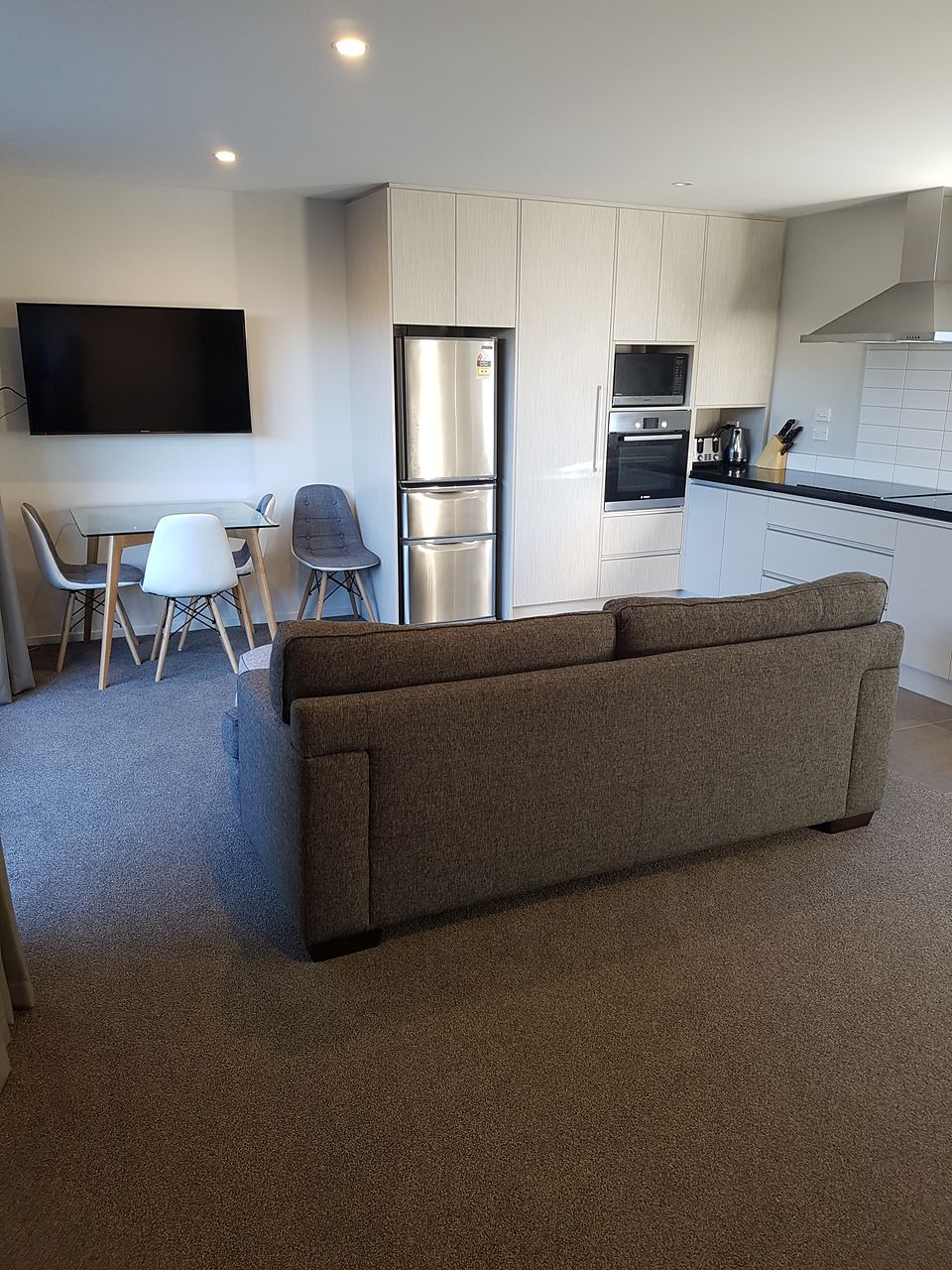 Living area with lounge suite, wall mounted TV and dining table seated for 4 people