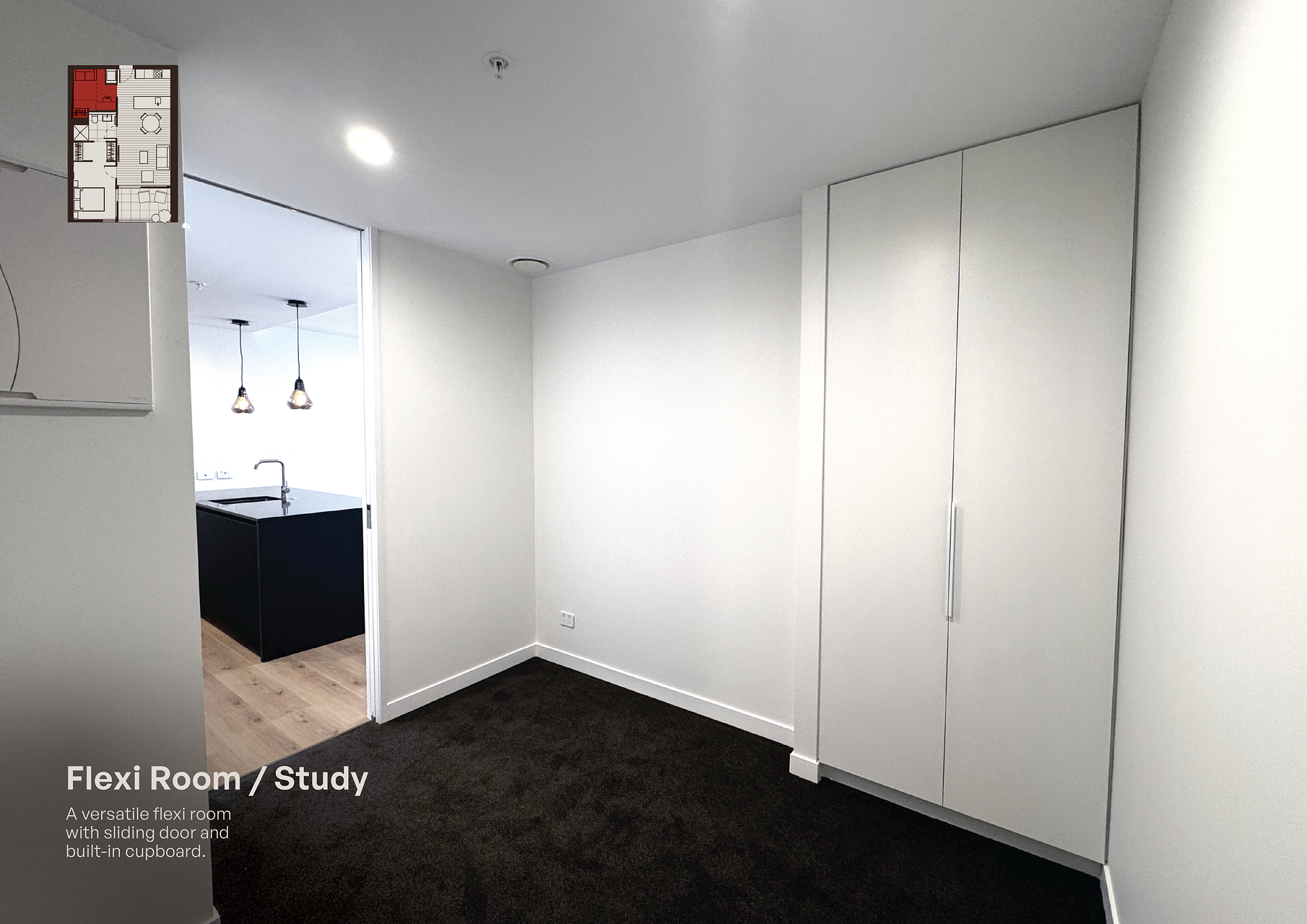 Second bedroom perfect for guests, study, or creative work – with built-in storage and a sliding door for privacy.