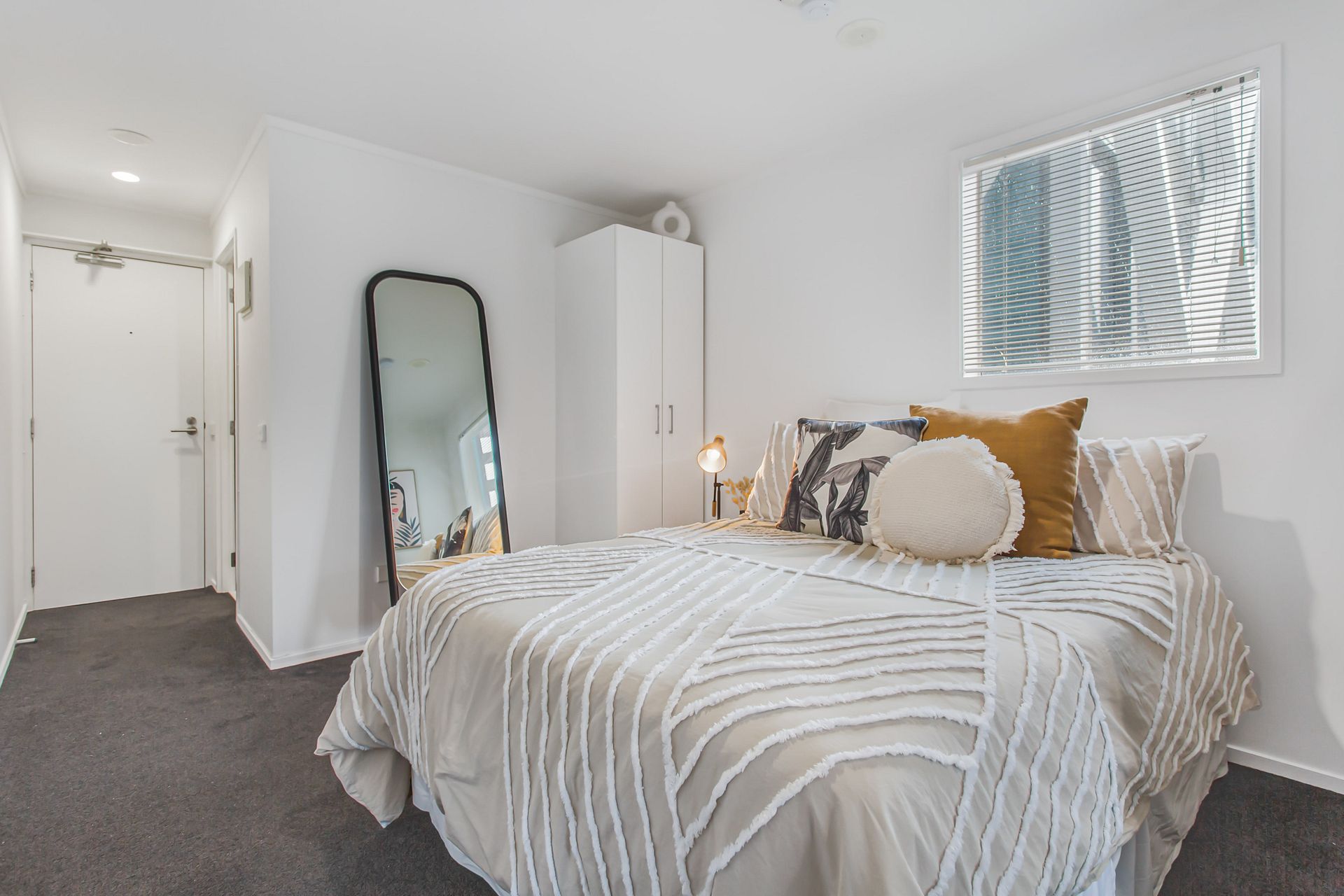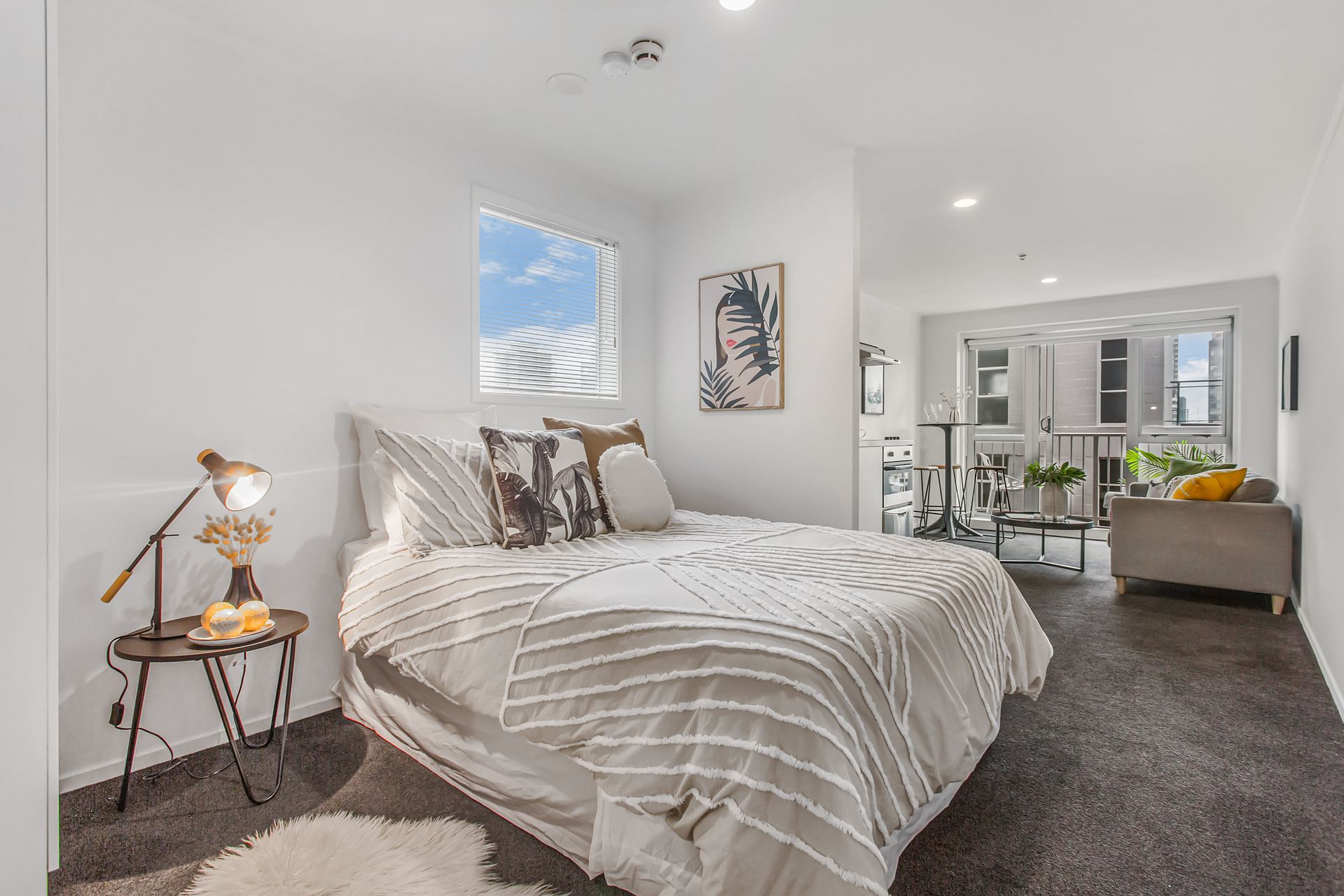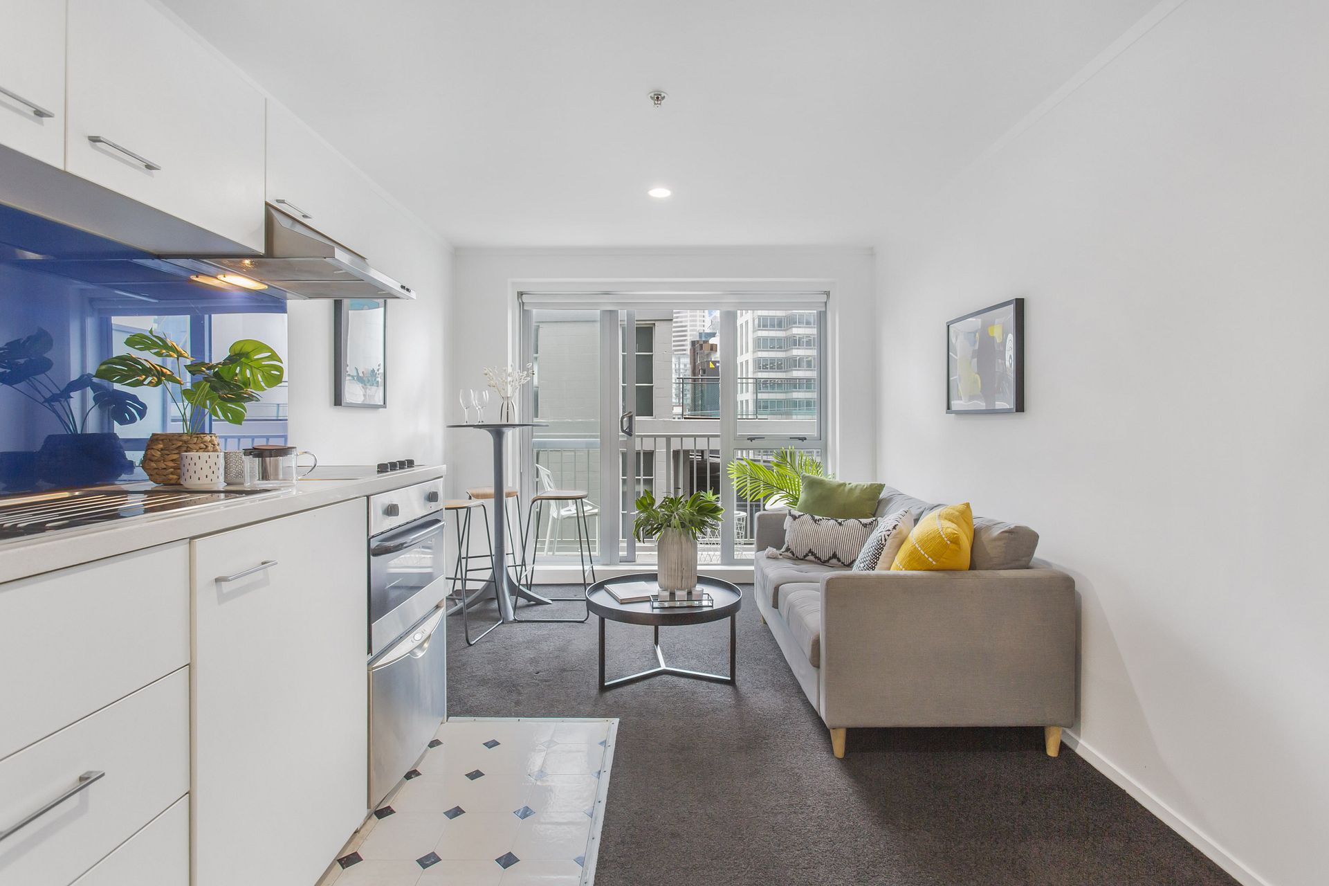 Fresh, functional, and tidy complete with under bench oven, cooktop, dishwasher, washing machine, dryer, vacuum, bed, vacuum cleaner, TV, cutlery, etc etc.