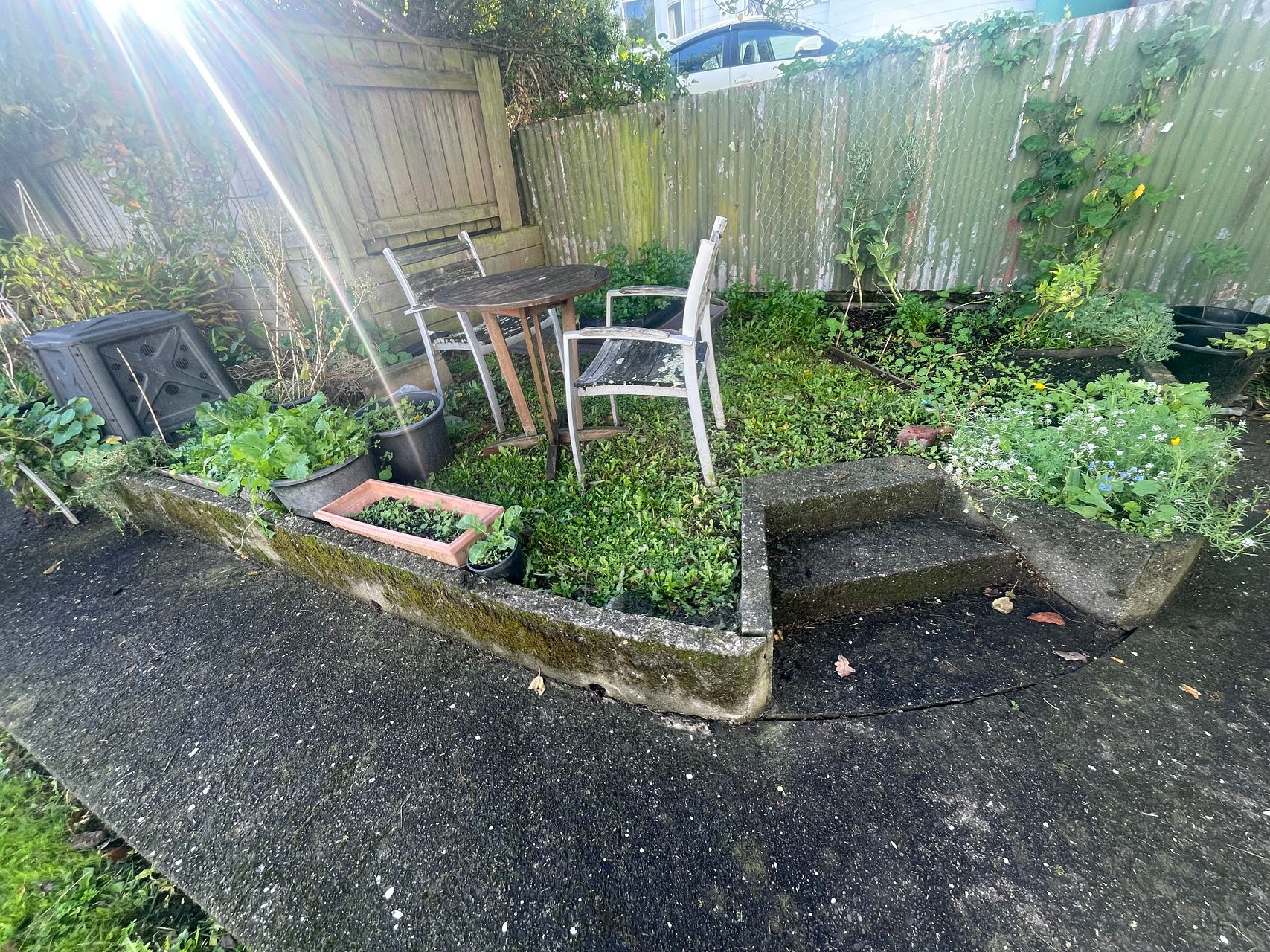 A shared backyard soaked in sun, including a vegetable garden and outside cloths-line, heating, and a washing machine, providing added convenience for tenants.