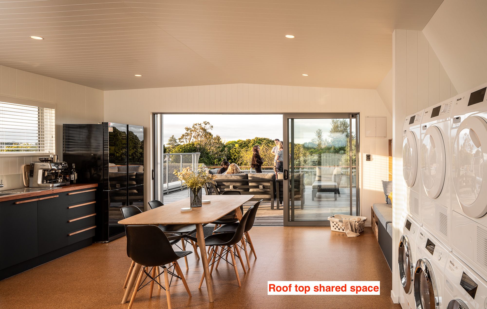 The apartments have solar hot water and solar PV power. There is a gorgeous shared area on the rooftop share with friends and neighbours with 360 degree views, with shared Miele washers & dryers, a coffee machine with supplies provided, Weber BBQ, Ooni Pizza oven, and books and toys for the kids. There is a workshop to fix things and do small DIY projects.