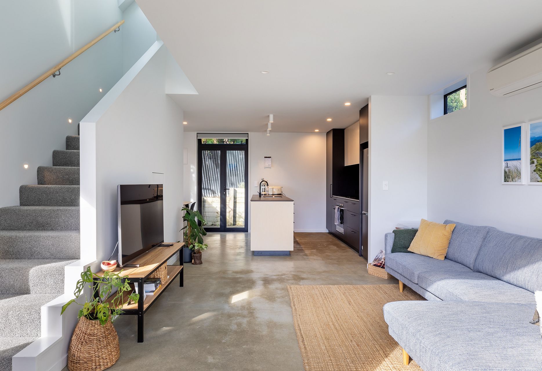 Inside, revel in the contemporary ambiance with concrete flooring in main areas and plush carpeting in bedrooms. The smaller room can be used as a lounge or home office setup.