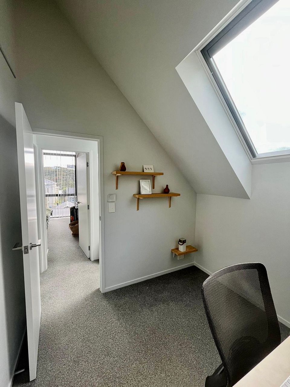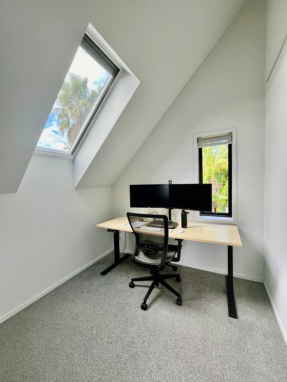 Appreciate modern comforts like triple-glazed windows and solar-powered Velux skylights (remote operable), along with a sleek tiled bathroom featuring a large walk-in shower, double sinks, and a backlit mirror.