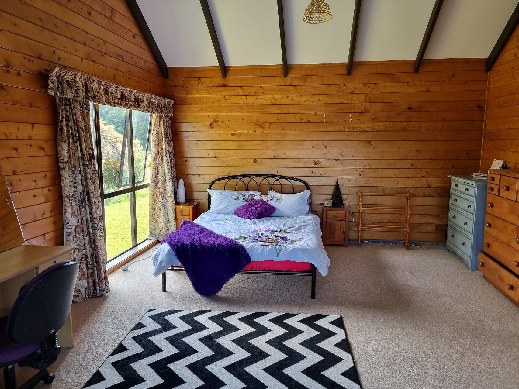1 large bedroom, with a sunny room overlooking the pond with dycks and lilis and and open plan lounge and kitchen