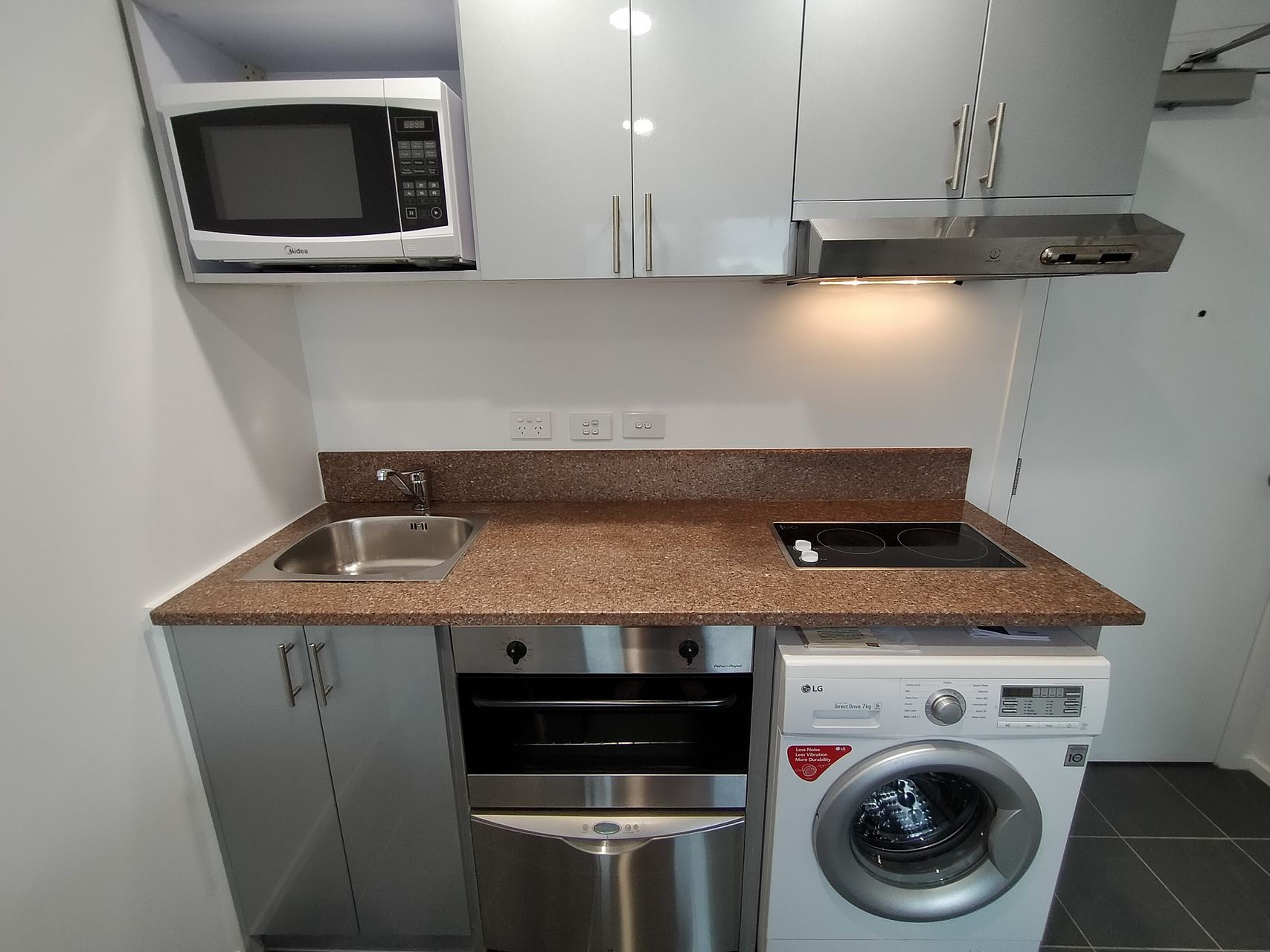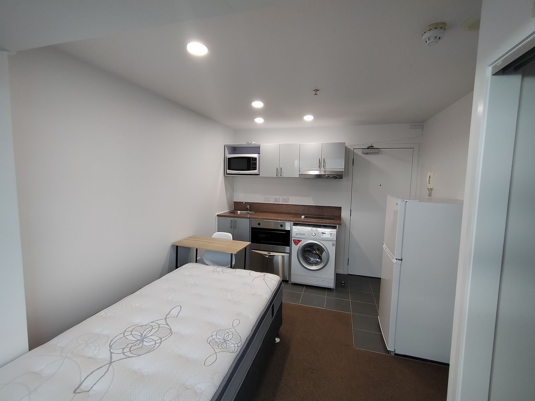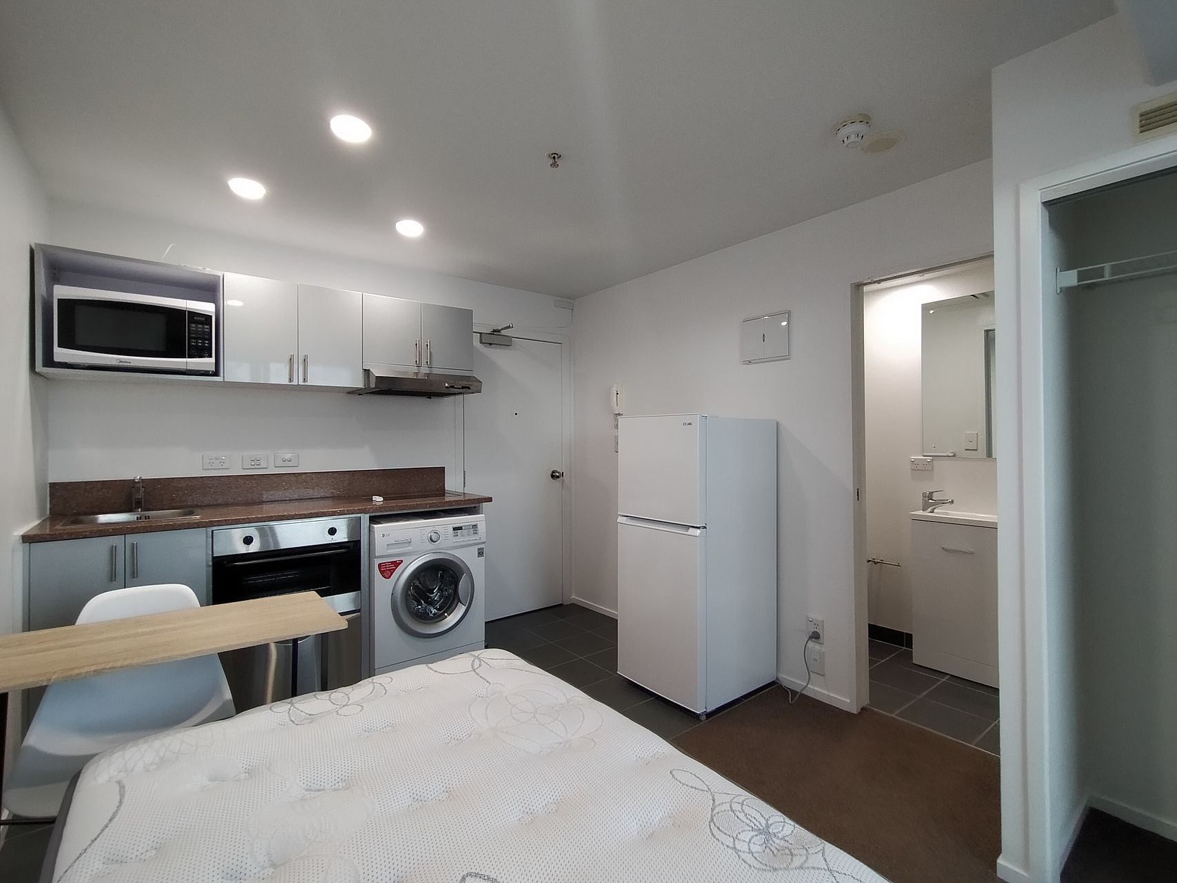 Full size kitchen, dishwasher, cooktop, full size fridge, washing machine & dryer (all in one), bathroom with shower, king single bed with new mattress + base, closet, heater, heated towel rail.