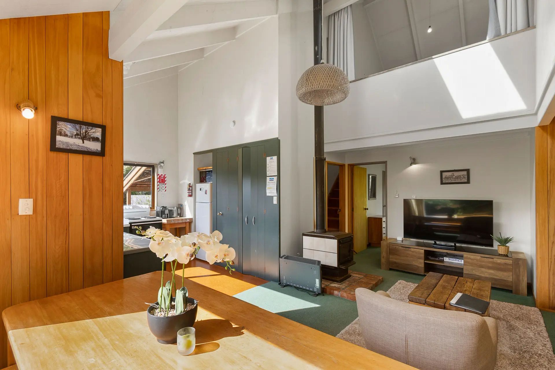 Convivial open-plan living with wood burner heating