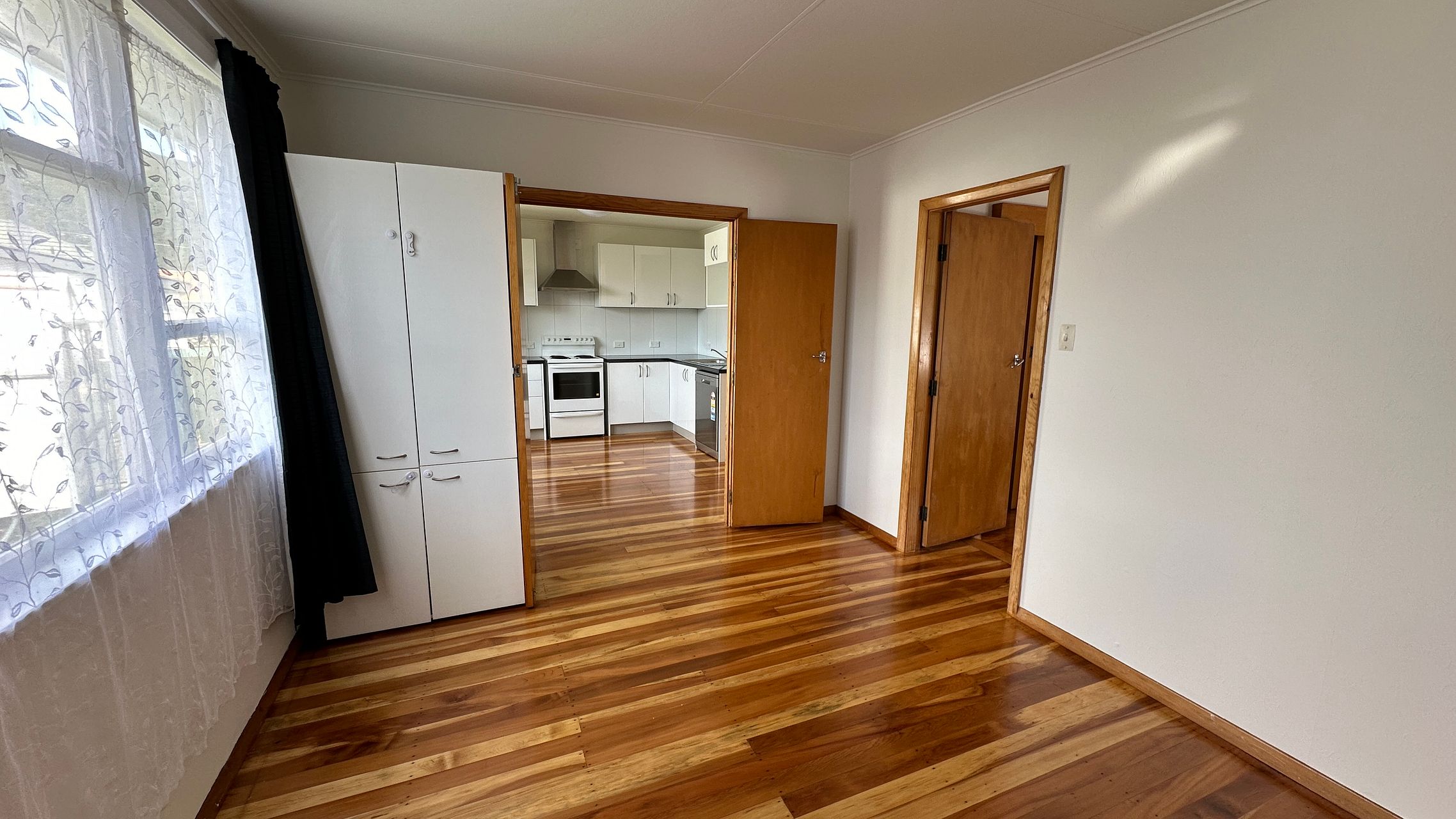 Nice, spacious, single-level one bedroom flat with lounge, kitchen/dining and bathroom/ laundry. In addition to all the cabinets and pantry in kitchen, the flat has plenty of storage including large built-in cupboard in the hallway, a free-standing unit in the lounge and a built-in double wardrobe in the bedroom. Keep warm with a wall mounted inverter panel heater in the living room and a wall-mounted ceramic panel heater in the bedroom.