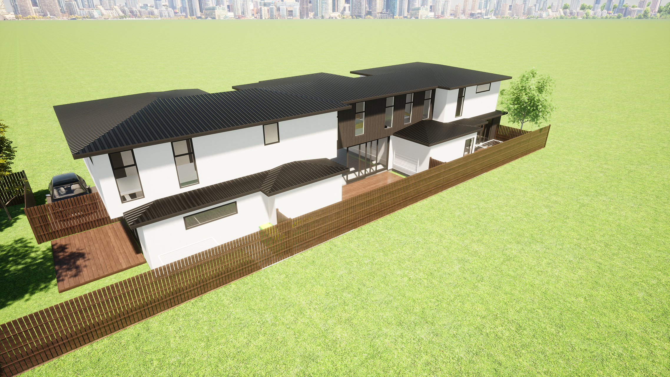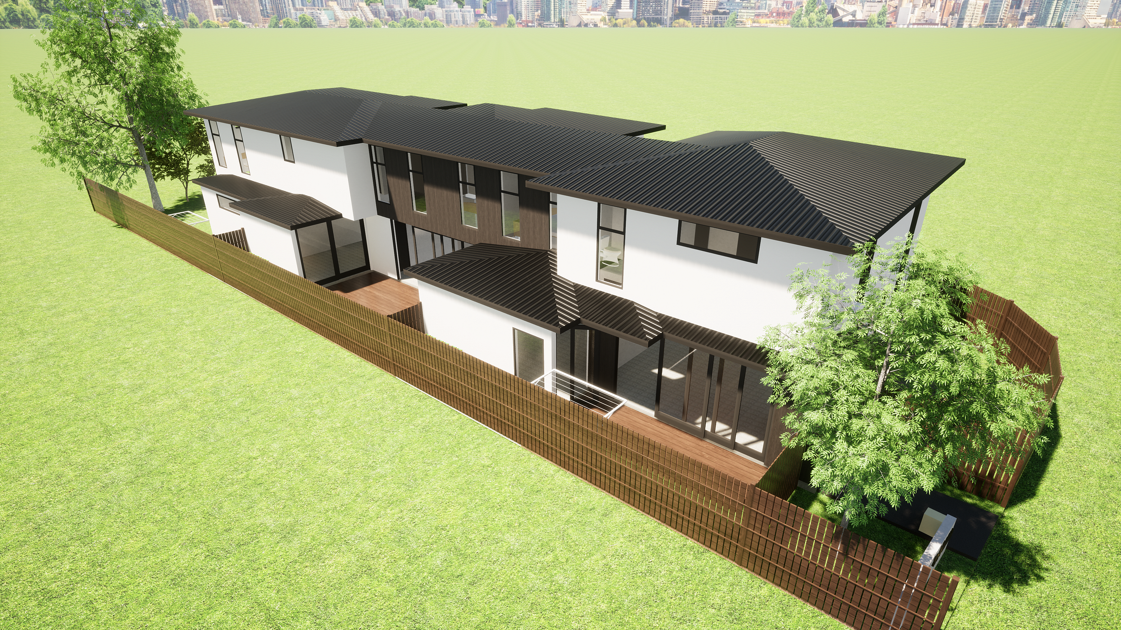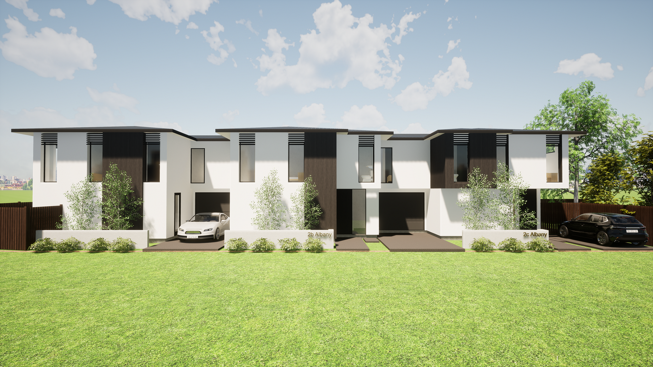 One of three townhouses, all with direct access to the street, no shared driveway. This is the corner site with extensive north and west facing aspect, bathed in afternoon sun.