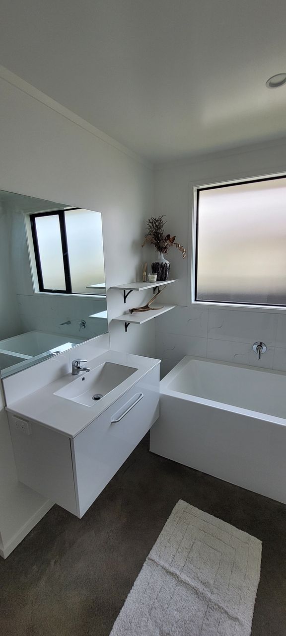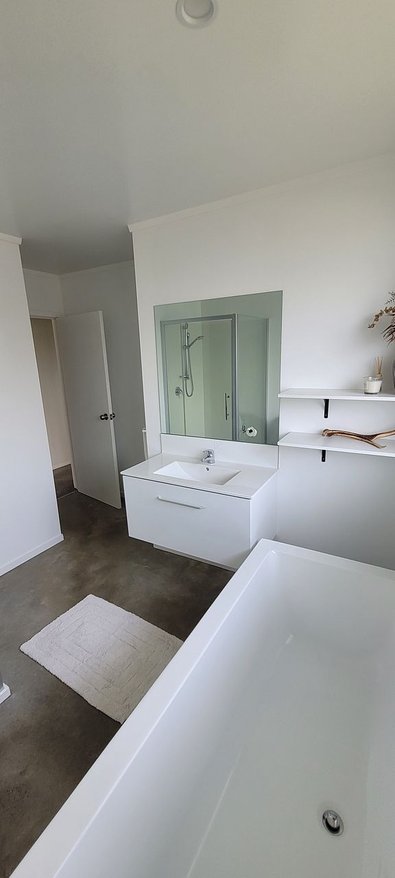 A bathroom with buthtub and a lundry cupboard equipped with a basin. There is space for 2 vehicles 1 off street parking and one on the property.
