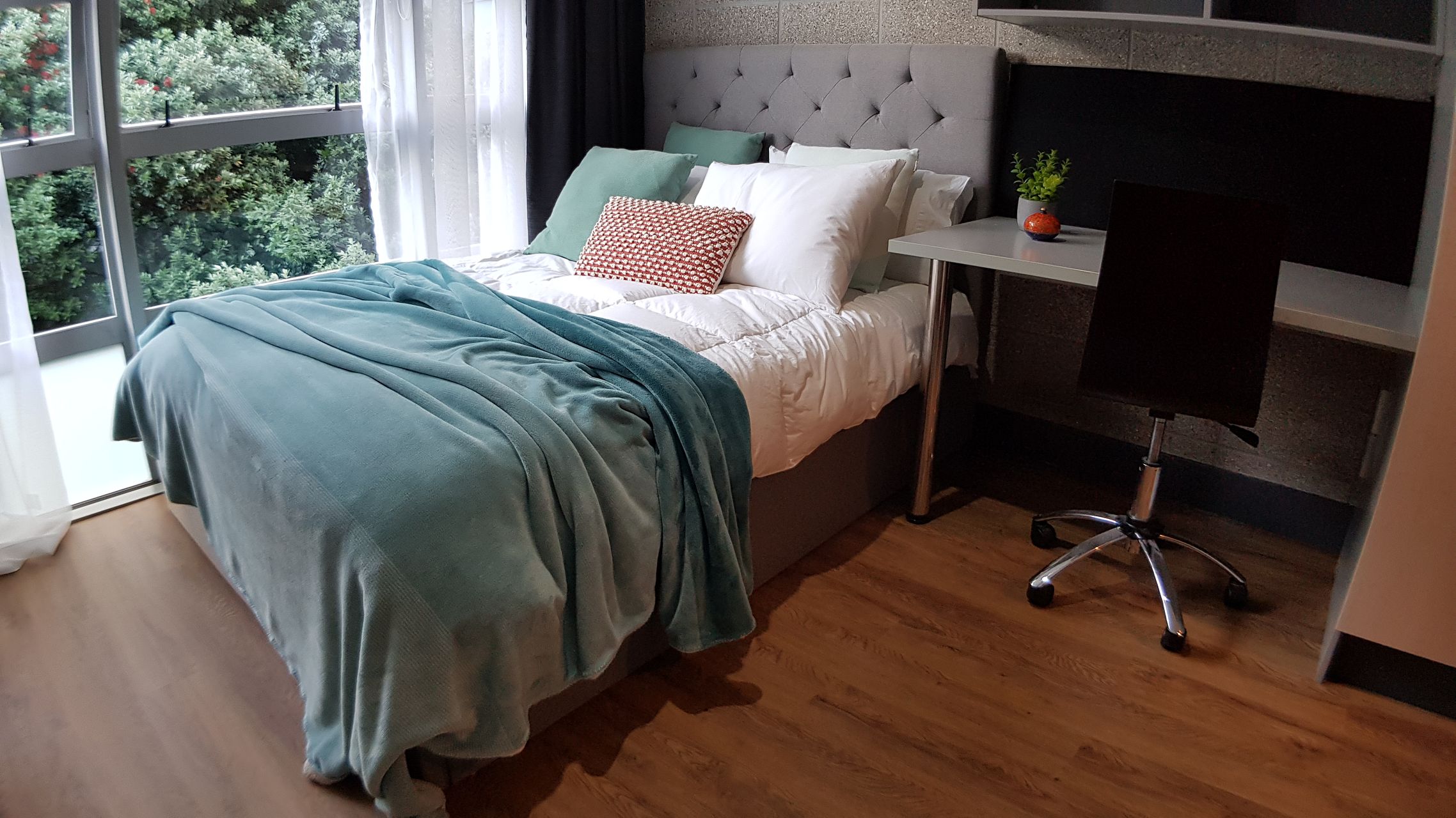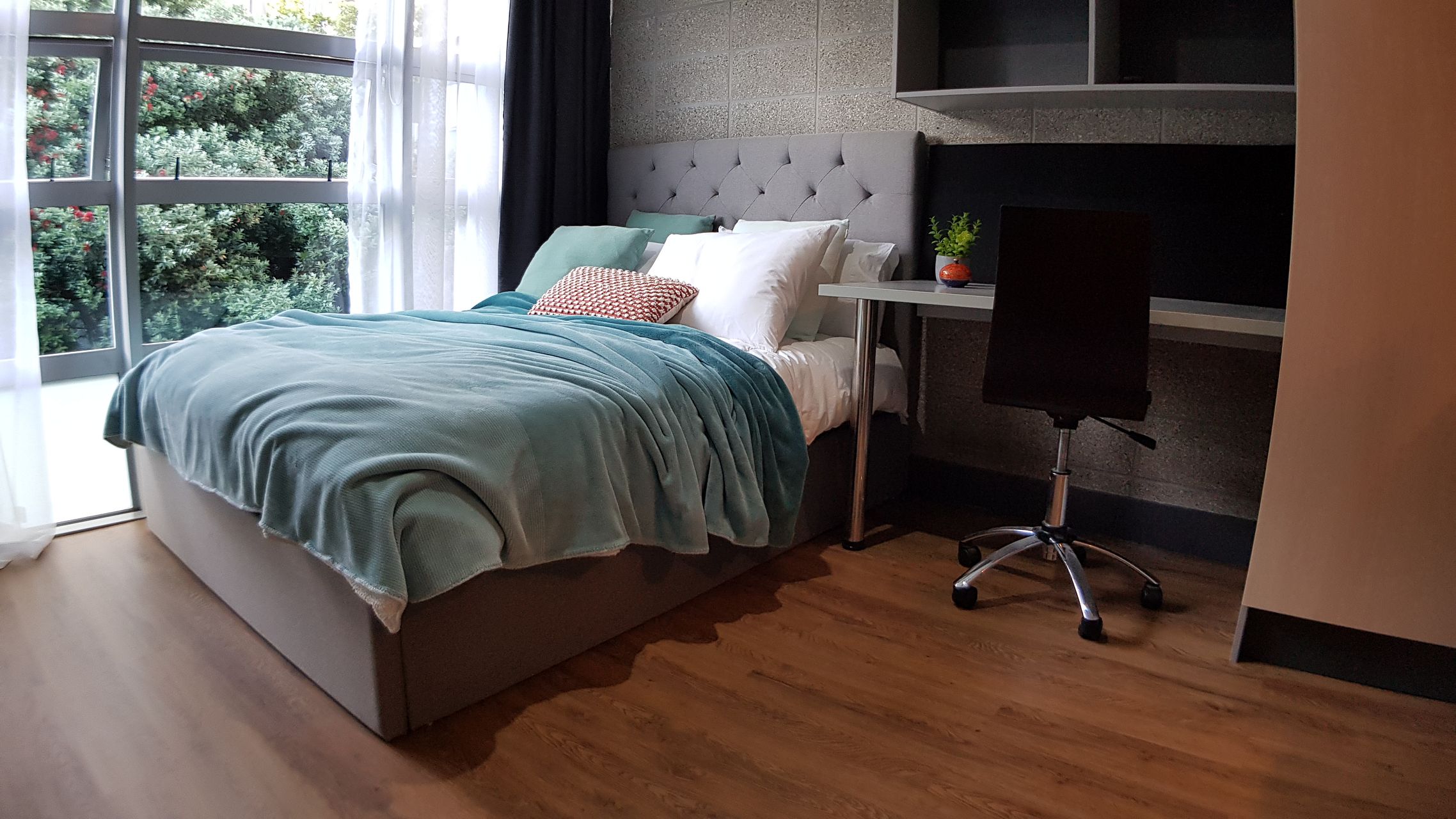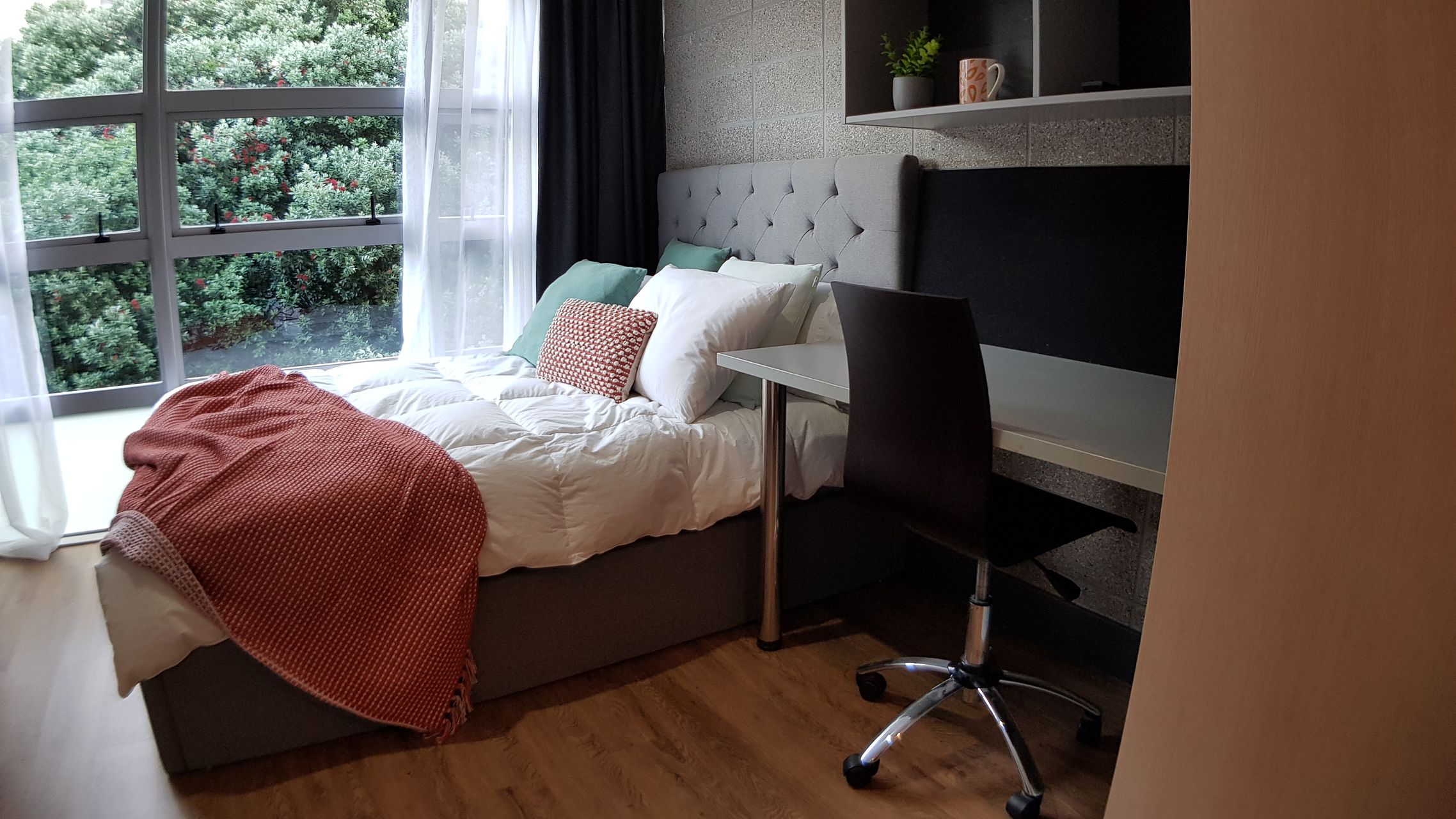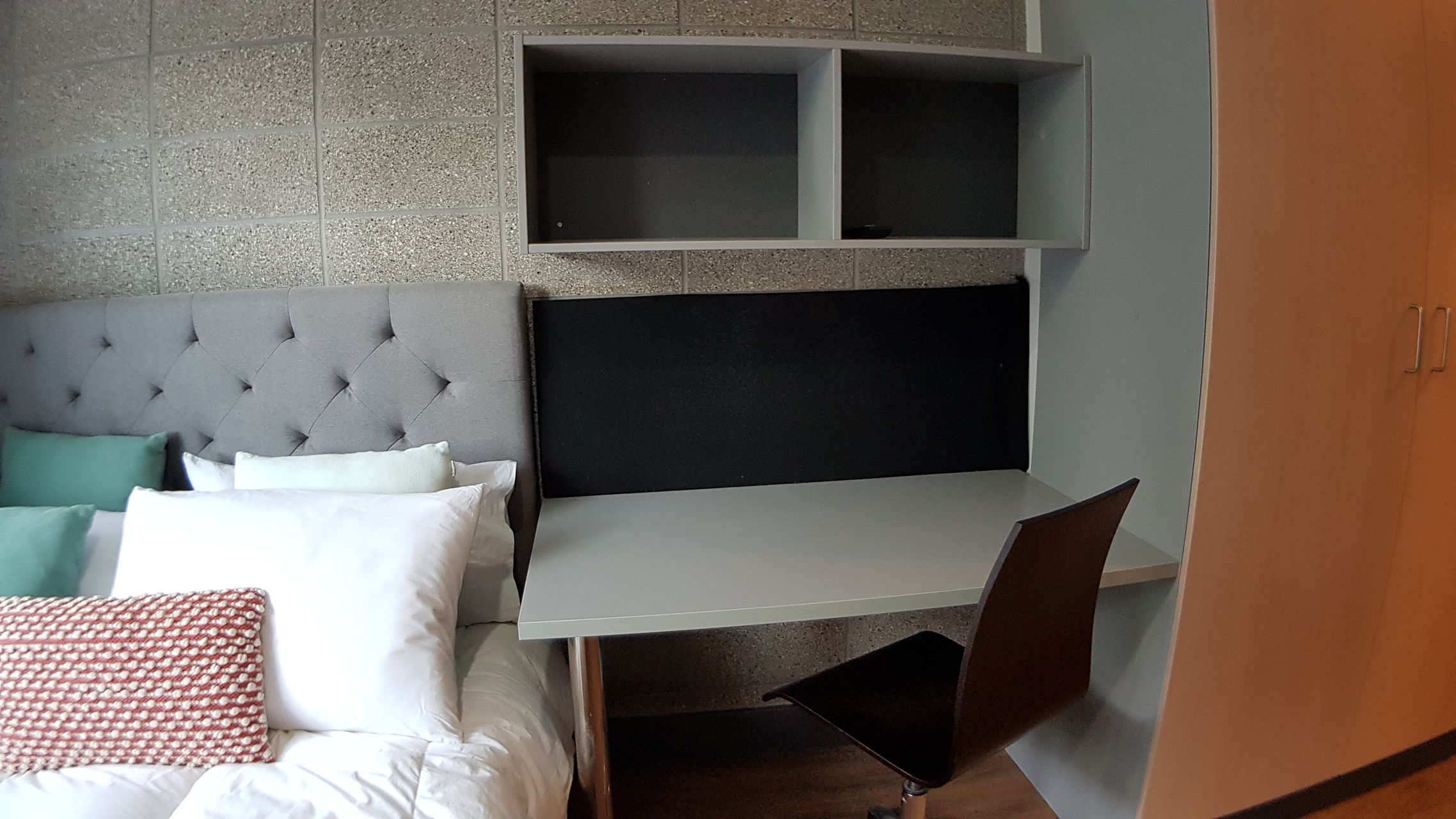 Furnishing: king single bed, large wardrobe, study desk & study chair, flat-screen TV (wall mounted), wall mounted heater.