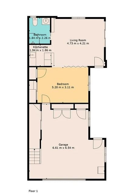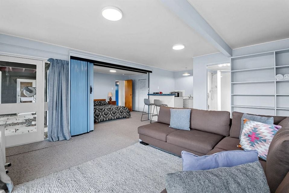 A studio, with small kitchenet, bedroom, lounge, and bathroom. Garage attached. Previous tenant used garage as office, washing machine, and storage.